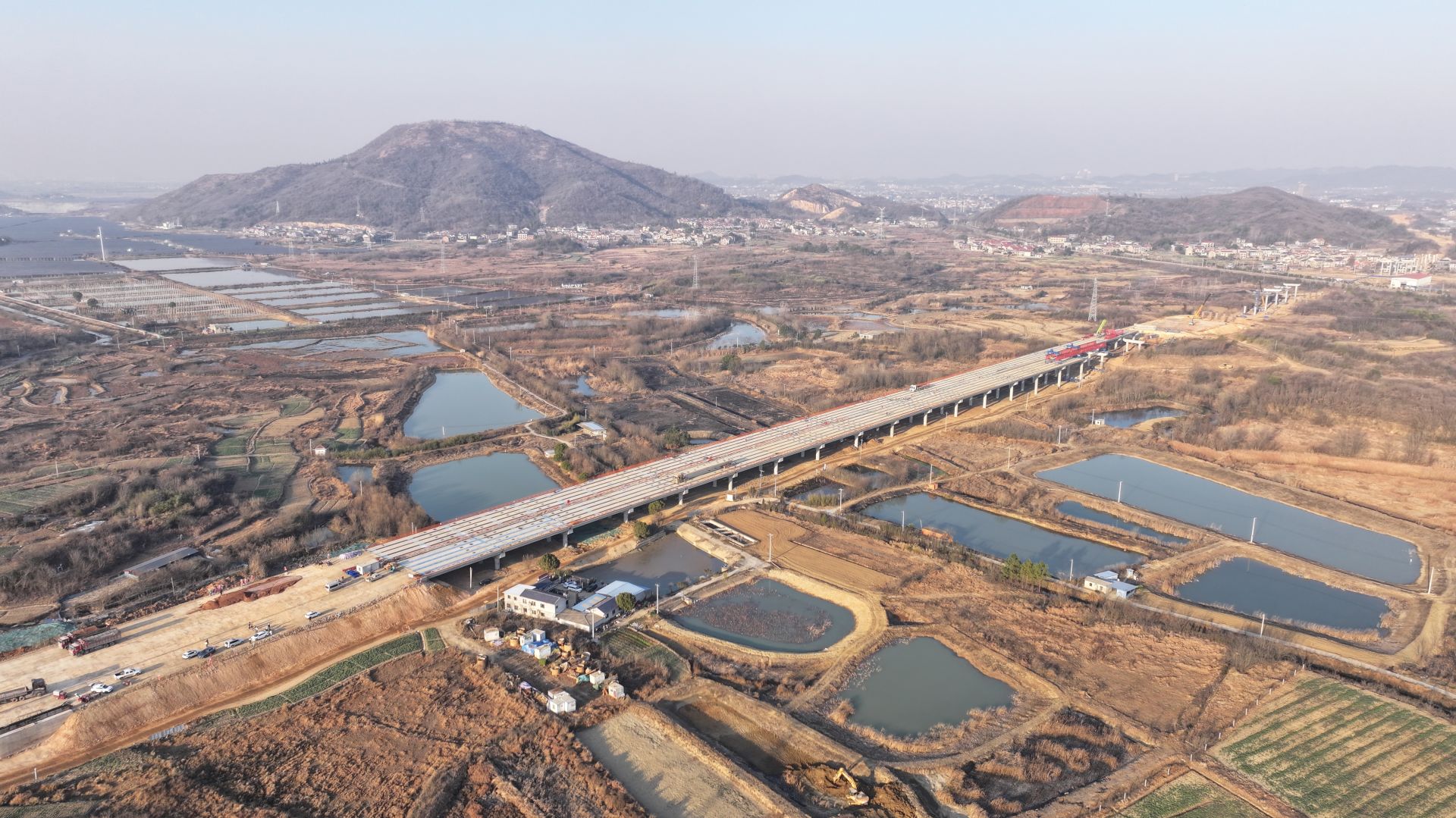 无人机升起,从空中远眺,另一侧的驾虹村大桥正在进行桥梁上部结构施工,连接两座桥梁的路基已进入路床施工阶段,整个道路的轮廓逐渐清晰。各工区也都在如火如荼地进行梁板架设、桩基施工等作业。