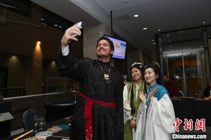 当地时间1月22日晚,中国驻蒙特利尔总领馆与中国驻国际民航组织理事会代表处在位于加拿大蒙特利尔的国际民航组织(ICAO)总部联合举办2025年春节招待会。图为与会来宾体验试穿汉服,并与当地华人汉服团体的青年人自拍。中新社记者 余瑞冬 摄