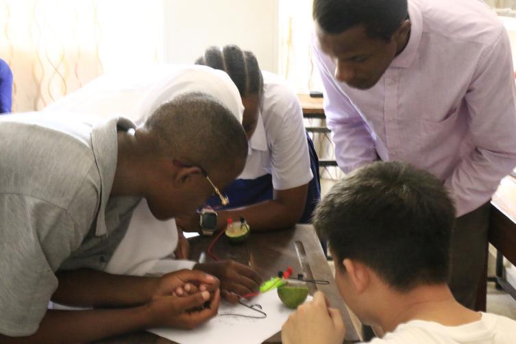 支教课堂上的水果电池实验演示环节。图片由清华大学探微书院“桑华筑梦”支队提供