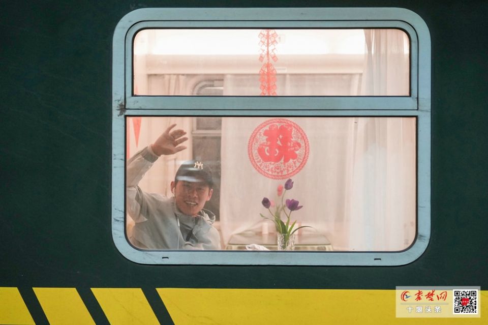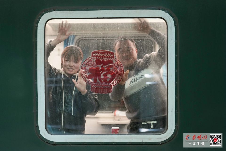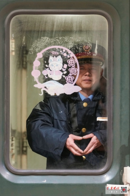 有人站在车窗旁,小心翼翼地在玻璃上贴上红色的窗花,为这趟归途增添一丝年味;