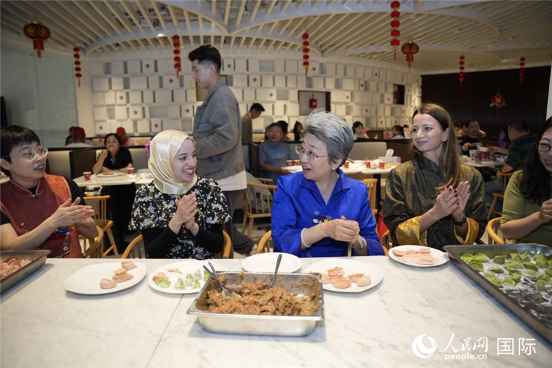 中国驻迪拜总领事欧渤芊与参与活动的外国友人一同包饺子。人民网 塔里克·易卜拉欣摄