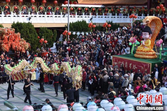 中新社洛杉矶1月29日电 (记者 张朔)龙狮欢舞、丝竹悠扬,一场引人入胜的春节庆典于乙巳蛇年大年初一在美国著名佛教圣地佛光山西来寺举行。