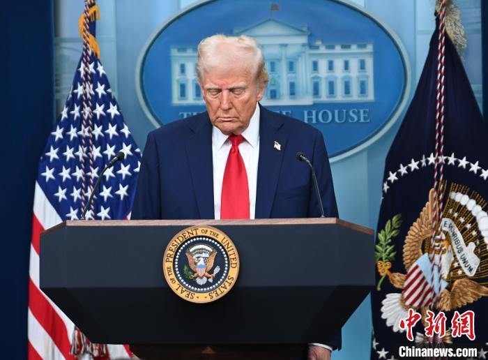当地时间1月30日,华盛顿,美国总统特朗普在白宫举行记者会,通报1月29日华盛顿撞机事故情况。他说,这起客机与军用直升机相撞事故无人生还。图为特朗普在记者会开始前为事故遇难者默哀。 中新社记者 陈孟统 摄