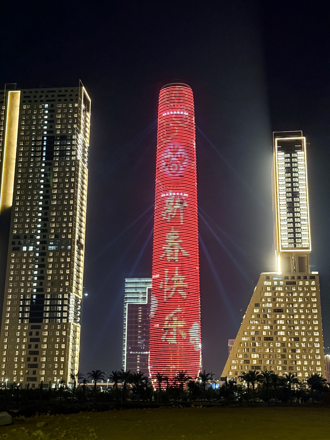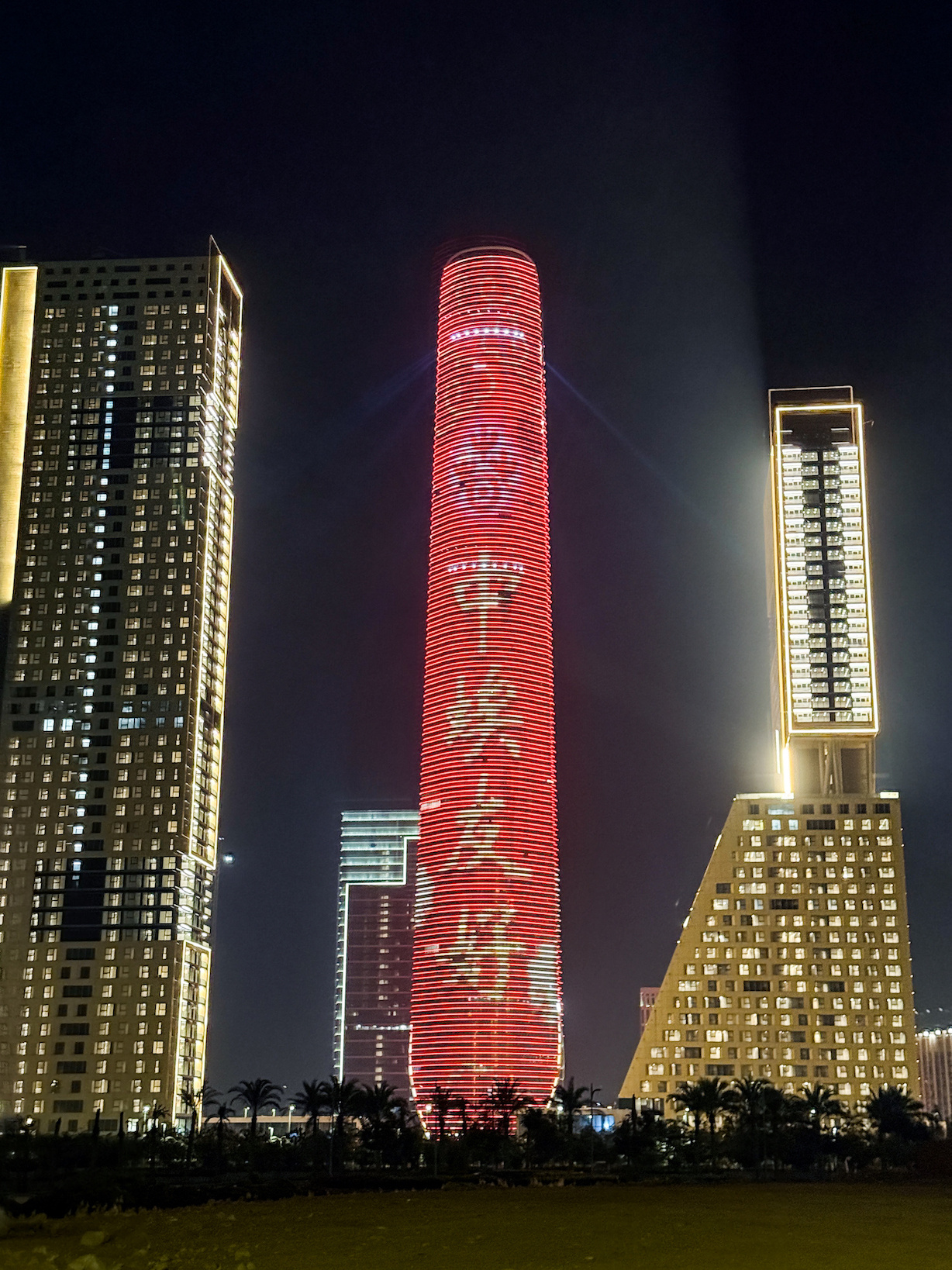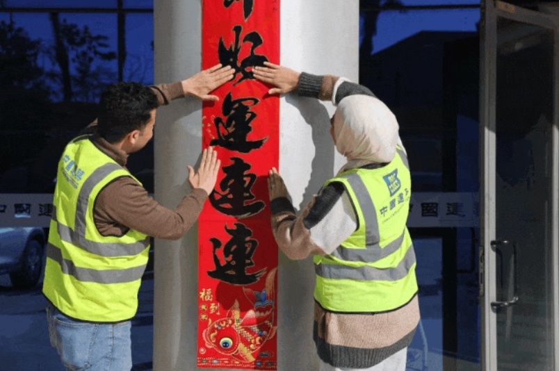 除夕之夜,埃及新首都CBD项目的“非洲第一高楼”标志塔化身大屏幕,打上了中文祝福标语,尽显节日喜庆氛围,传递对中埃友谊与新春佳节的美好祝愿,同时向奋战在项目上的中国建设者致以新春佳节的问候!春节期间,中埃员工一起写对联、贴对联、包饺子,共同庆祝新年。