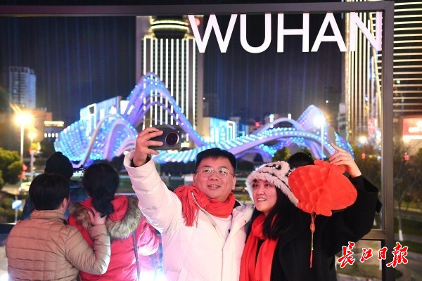 流光溢彩的星河广场打卡点,从深圳回武汉过年的小余和妻子兴奋地用手机拍照留念。