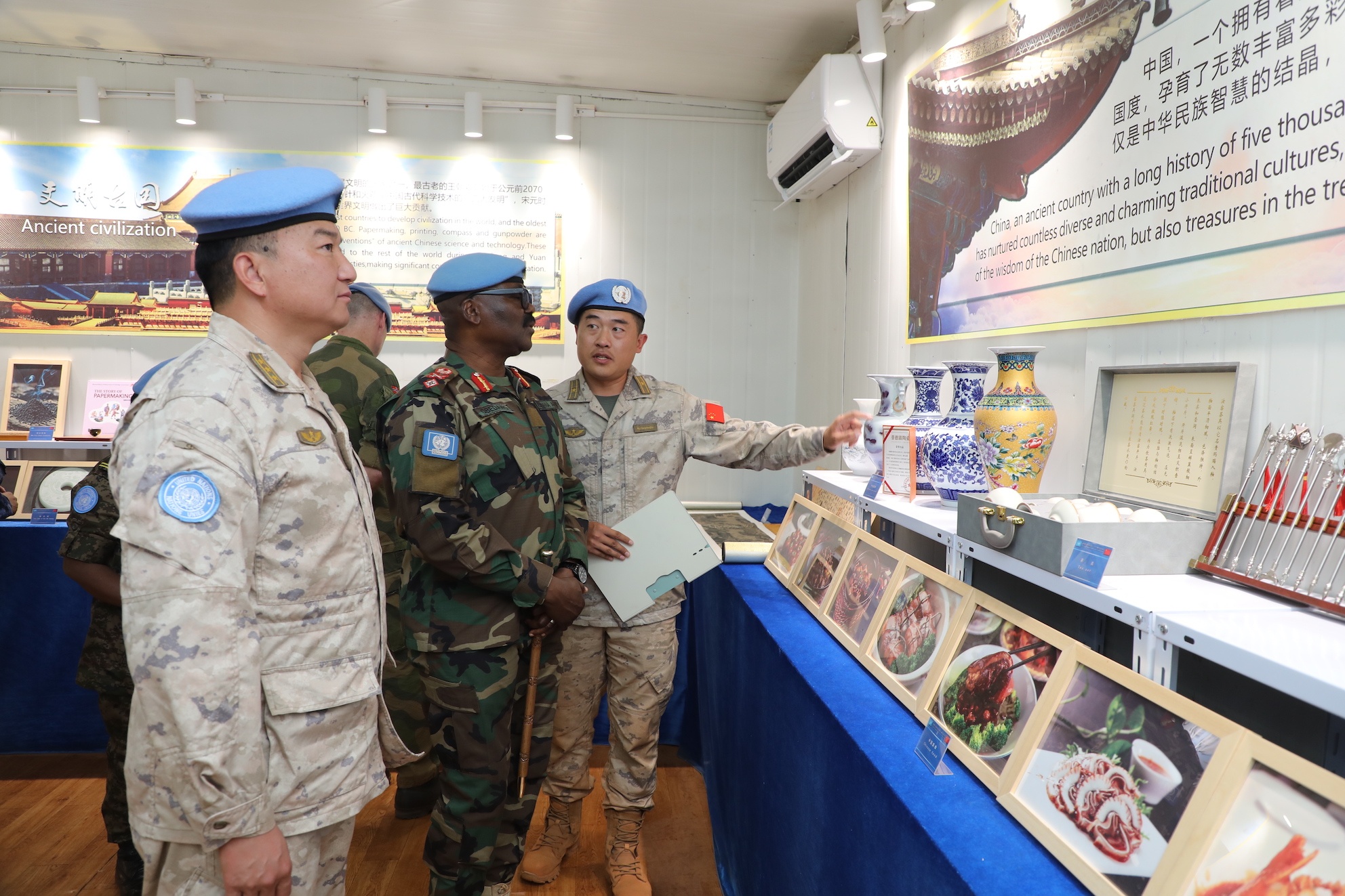 在中国营区“中国文化展馆”,中国的文化展品吸引众多外国友人前来观赏。维和官兵为前来参观的国际友人展示了中国瓷器、洛阳唐三彩、陕西兵马俑、京剧等多项非物质文化遗产及特色工艺制品,还展示了歼20、长征7号运载火箭、中国空间站、嫦娥6号等实物模型,给观众带来强烈的视觉震撼力和表现力。从历史悠久的非遗文化,到与时俱进的“国潮”魅力,再到科技与文艺碰撞融合的中国文化,让参与者在这场充满欢乐与喜庆的文化交流盛宴中,深刻体验到文化互鉴与共享。
