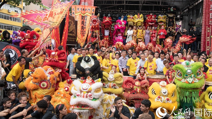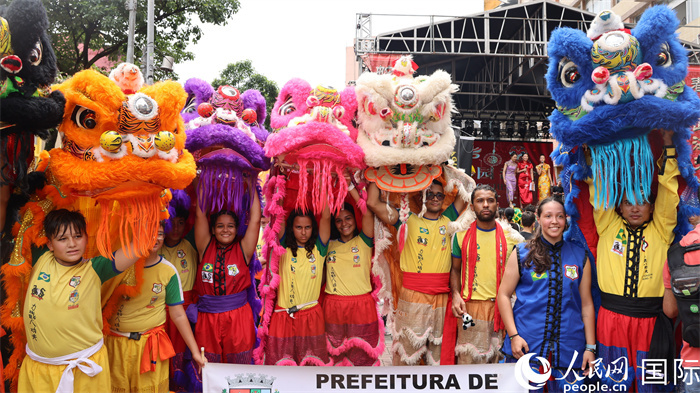 由巴西青年组成的舞狮队在合影。人民网记者 时元皓摄