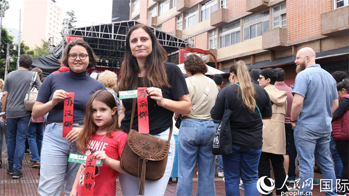 除了现场表演外,在舞台周边的摊位前,当地民众还能体验中国书法、试穿中国传统服饰、品尝特色小吃……圣保罗州立大学孔子学院设置的摊位前排起了长龙。在这里,巴西人将自己的葡文名字写在小卡片上,由孔院的志愿者翻译为中文并写在红色的纸条上。孔院教学秘书主管法比阿诺·洛佩斯告诉记者,希望通过设置这一摊位面向更多巴西人推广汉语和中国文化。
