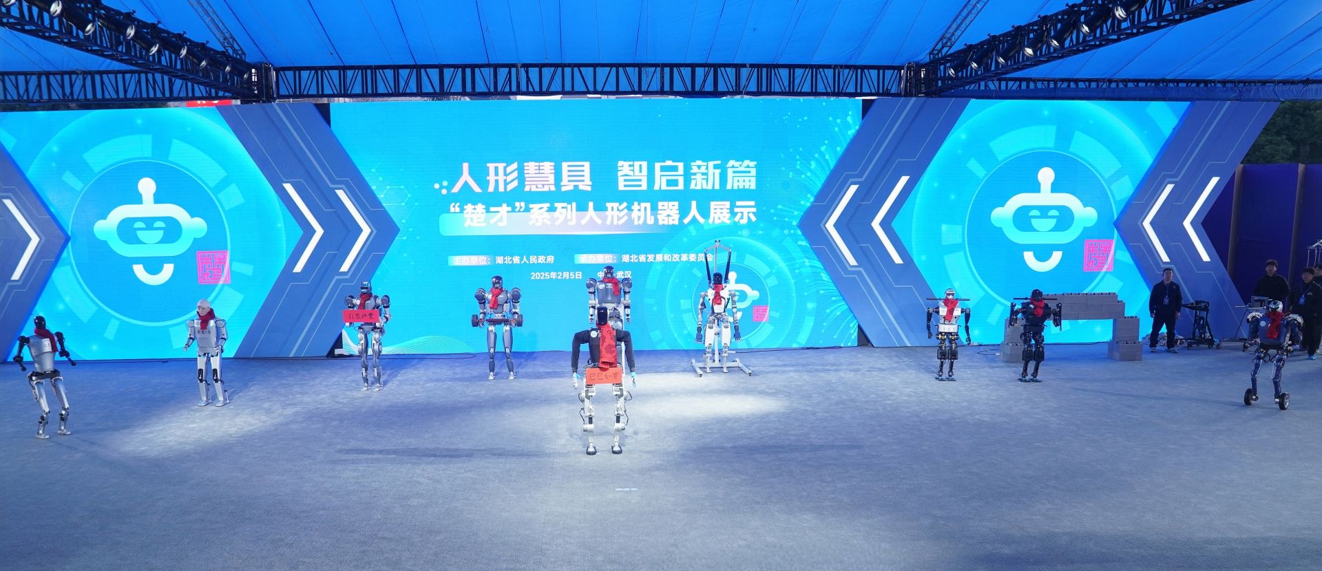 “人形慧具送福来,智启湖北新篇章,祝湖北人民新春大吉,万事如意。”2月5日上午9点,蛇年新春第一个工作日,湖北省在武汉洪山礼堂南广场举行楚才系列人形机器人展示,人形机器人“劳动者”现场送祝福。“荆楚”“神农”“劳动者”“天问”“楚宝”等10款人形机器人同台亮相,各展“绝活”。它们或手握哑铃展示力量,或面对外部推搡依然稳步行走,或面带微笑与人互动,或主动伸手与嘉宾握手,或被推倒后能迅速站起……精彩的表现,展示出湖北人形机器人研发最新成果,标志着湖北人形机器人整机实现从0到1、从无到有,为蛇年新春增添了一抹亮丽的科技色彩。楚才系列人形机器人分别由华中科技大学丁汉院士团队、陈学东院士团队,武汉大学刘胜院士团队,以及武汉光谷华汇黄强教授团队精心研发。