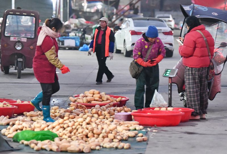 顾客在湖北润信农产品批发市场买藕