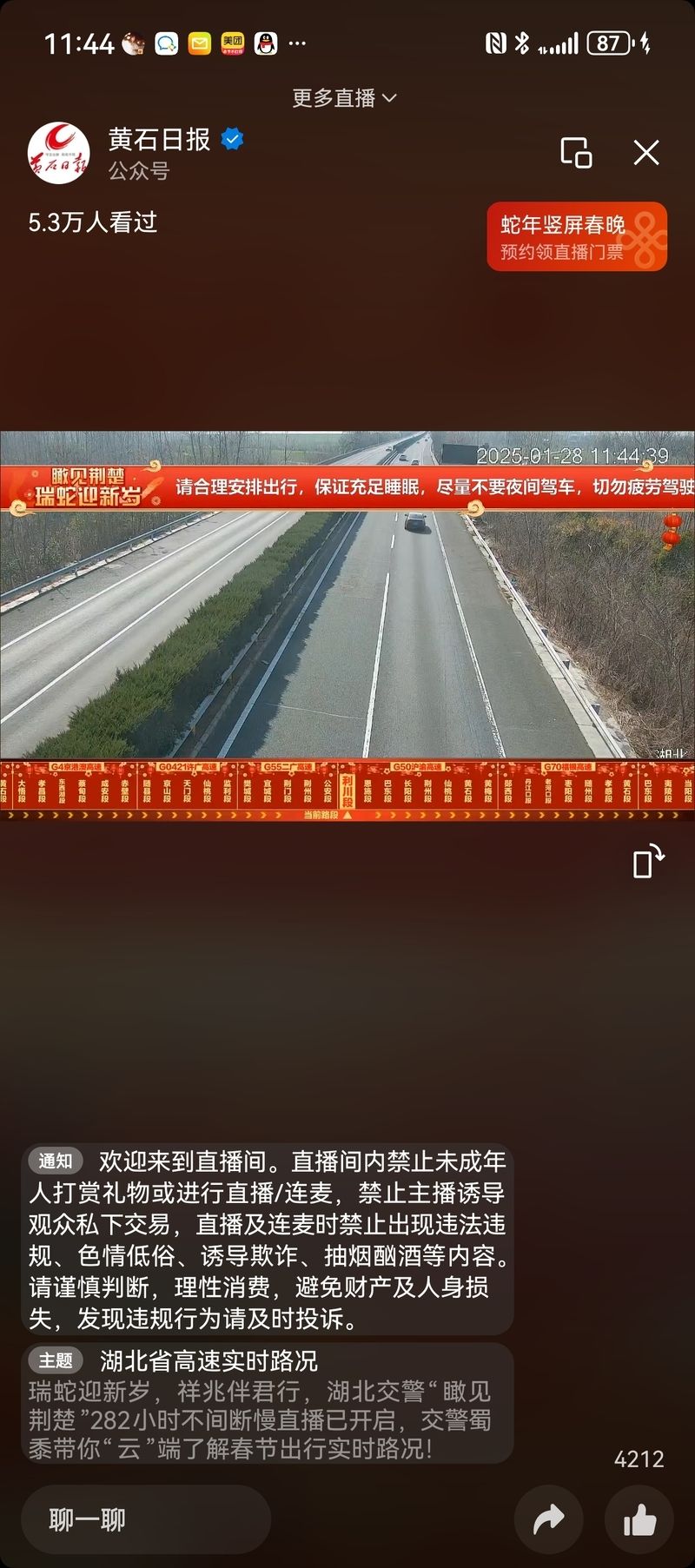 观看“瞰见荆楚”高速公路实时路况慢直播的