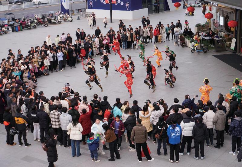 正月初二,市民在大冶市街头欣赏英歌舞表演。