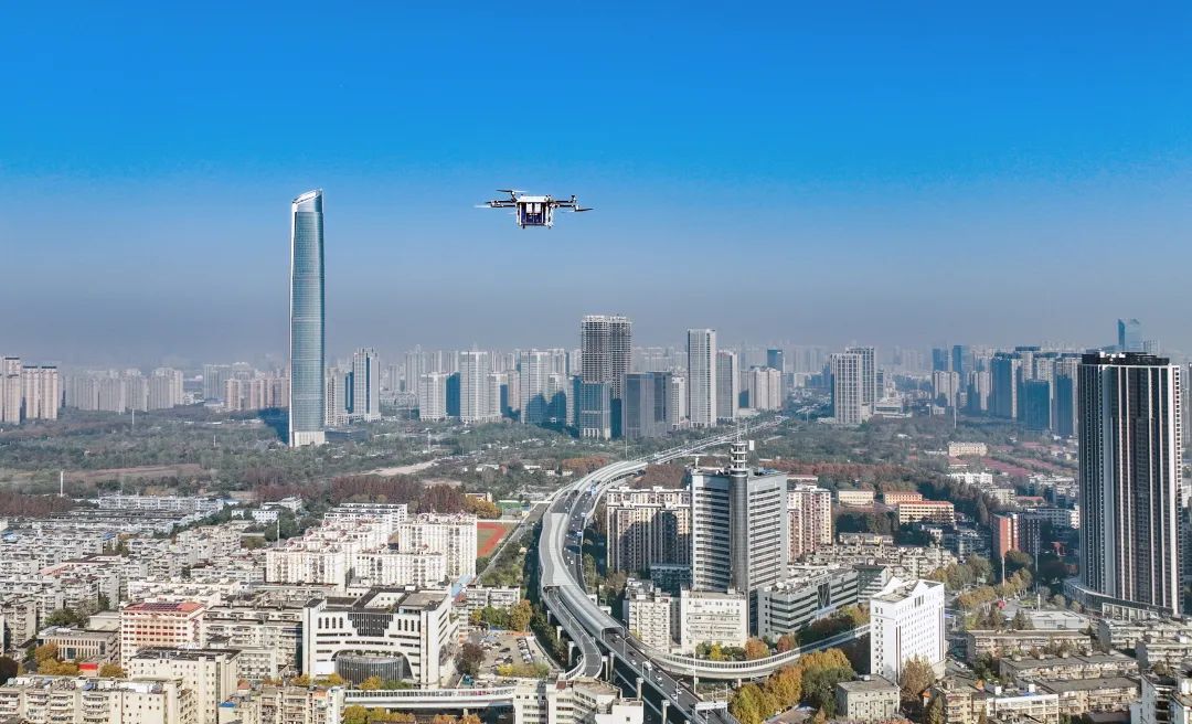 无人机在城市上空运送血浆快件赶往需要的医院