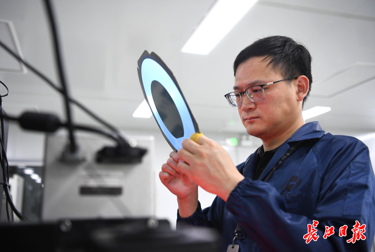 华工激光半导体产品线总监黄伟在实验室检查硅晶圆。记者高勇 摄
