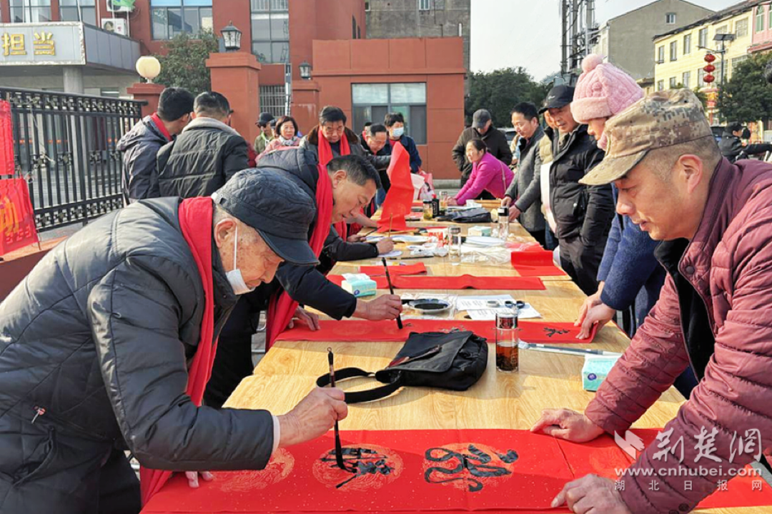 荆楚网(湖北日报网)讯(记者黄菲、李好 通讯员李健初、邹圆圆)龙腾四海辞旧岁,蛇舞九洲贺新春。蛇年春节前夕,走进孝昌县花西乡,镇区主街一侧格外热闹,案台上红火的春联纸铺陈开来,来自孝昌县书法协会的老师们正挽袖书作,写字的笔走游龙、一气呵成,作画的下笔有神、栩栩如生,传递着美好的新春祝愿。