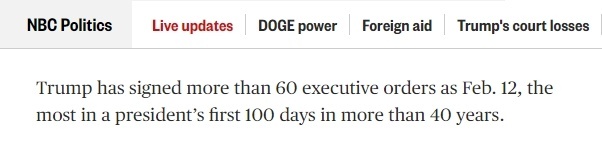 据美国全国广播公司(NBC)统计,截至2月12日,特朗普已签署了60多项行政命令,创下40多年来美国总统上任100天内签署行政命令数量之最。