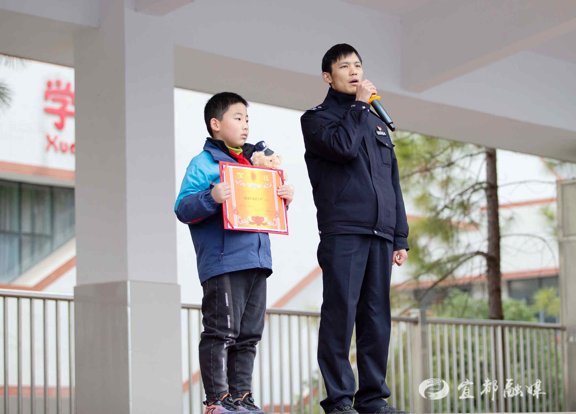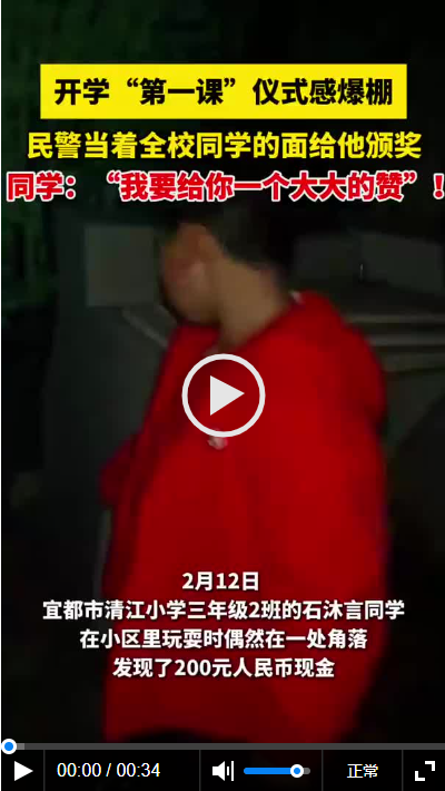 2月13日,新学期开学第一天,湖北省宜都市清江小学三(2)班学生石沐言就成为了学校的“风云人物”。在开学典礼上,宜都市公安局陆城派出所民警专门到校,用点名表扬的方式赞扬了石沐言同学拾金不昧的精神,并激励其他同学向他学习,争做新时代的“小雷锋”。