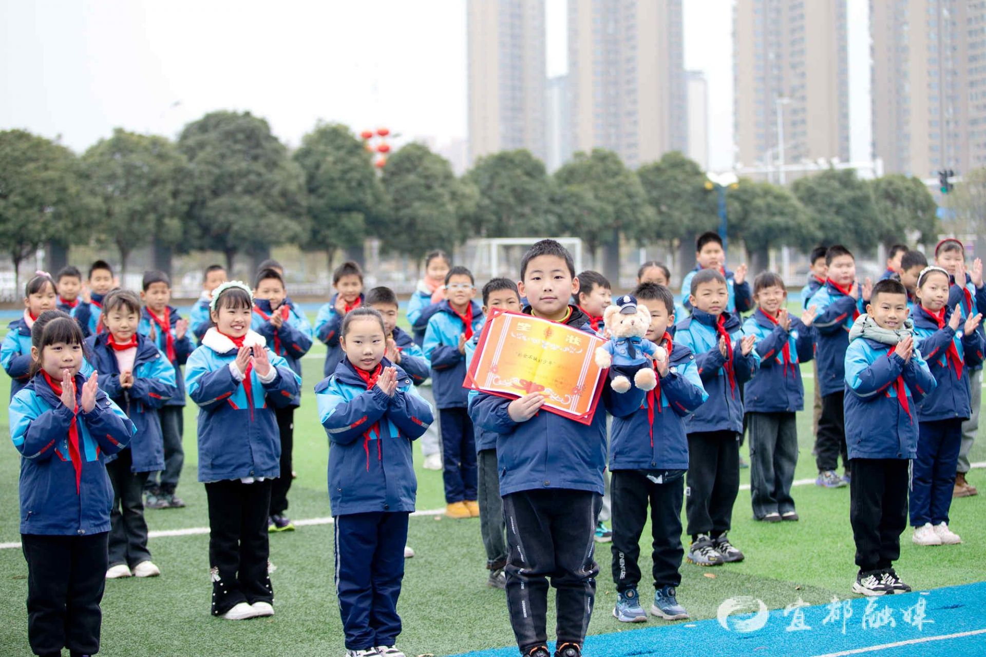 为了奖励石沐言小朋友拾金不昧的行为,陆城派出所民警特意赶在开学这天来到学校,在全校师生的共同见证下,为他送上了奖状和警察小熊。