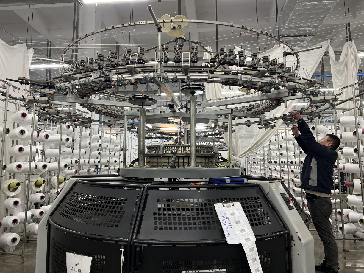 在湖北嘉麟杰纺织品有限公司的织造车间内,一台台先进的智能化针织大圆机正高速运转中,洁白的纱线在机器间快速穿梭。