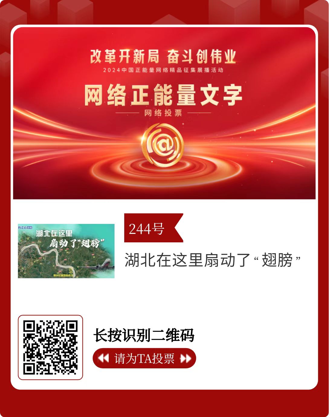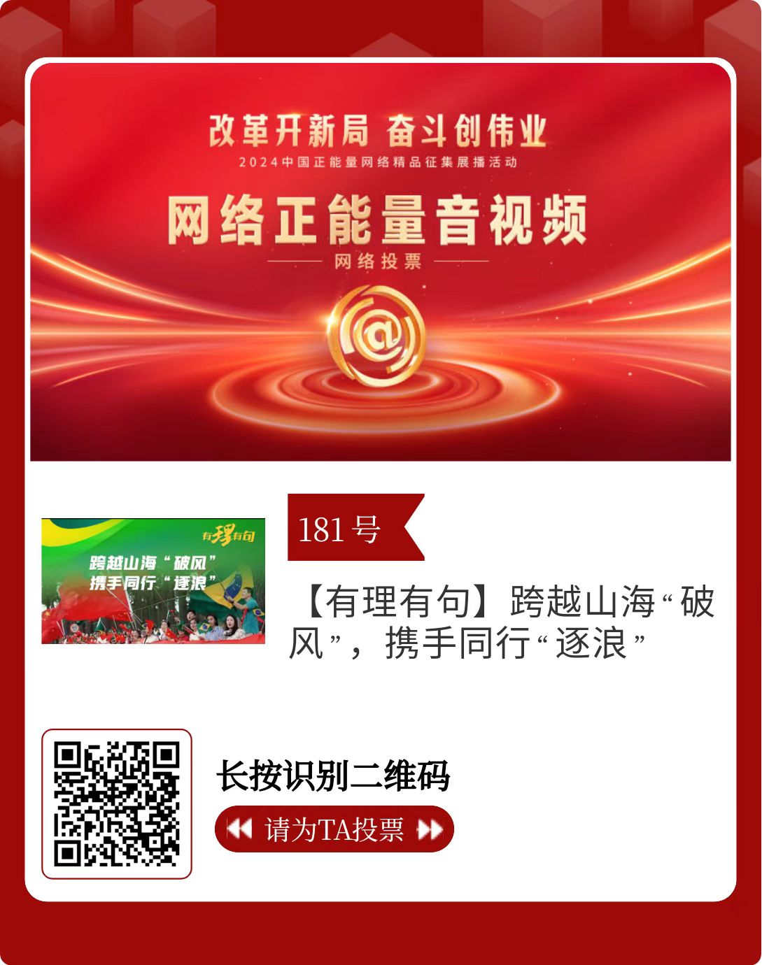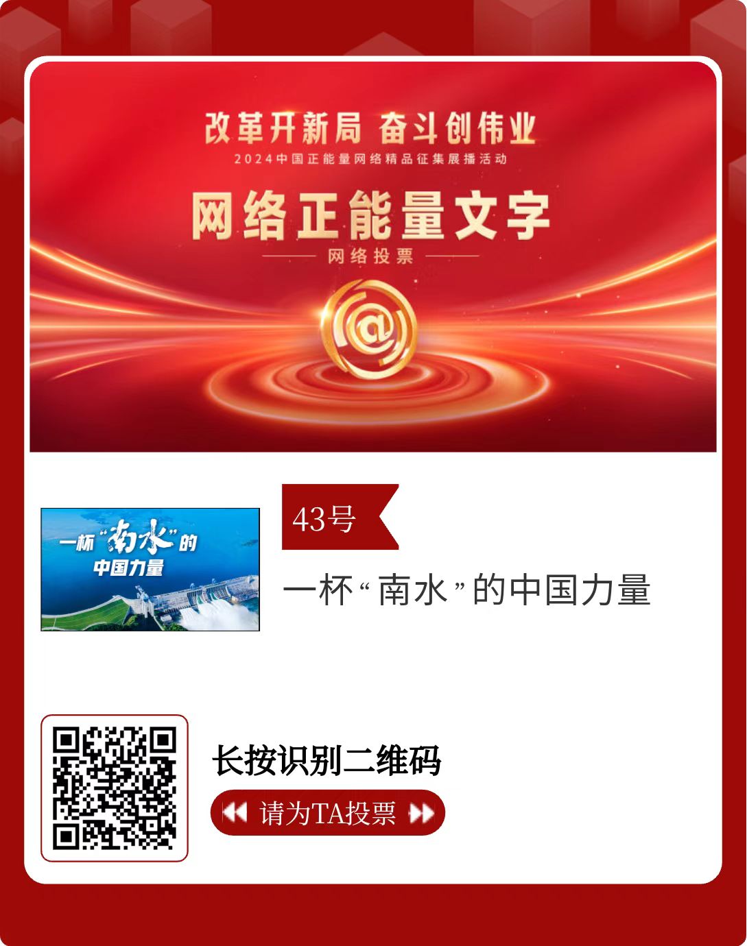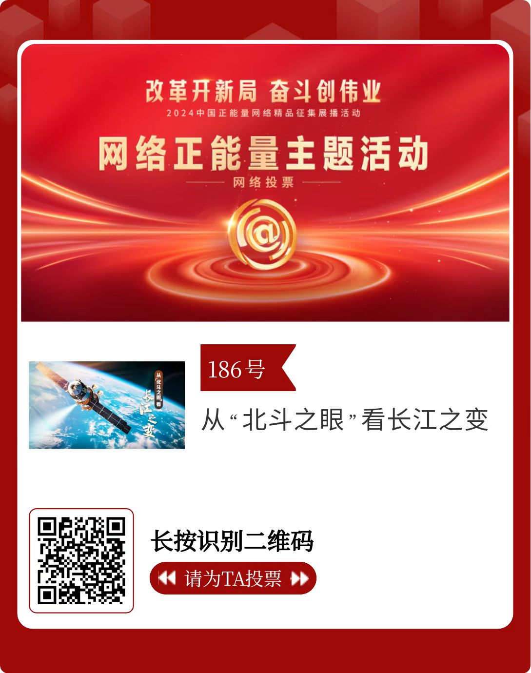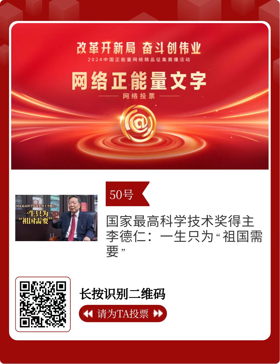改革开新局,奋斗创伟业。由中央网信办主办的2024中国正能量网络精品征集展播活动启动网络展播投票,时间为2月15日至2月21日,投票结果将作为中国正能量网络精品遴选的重要参考。