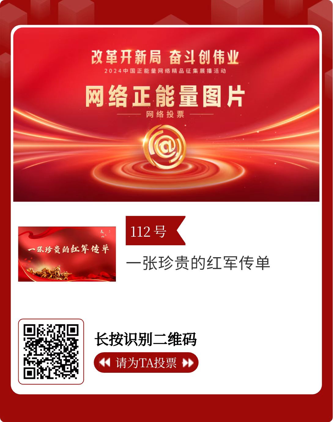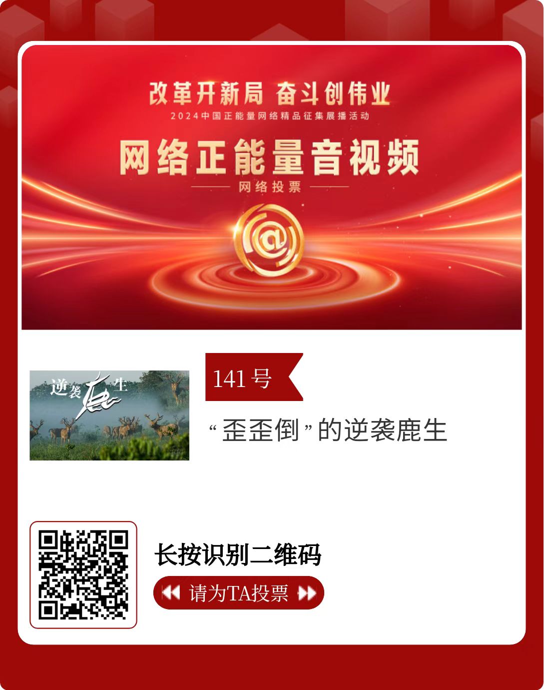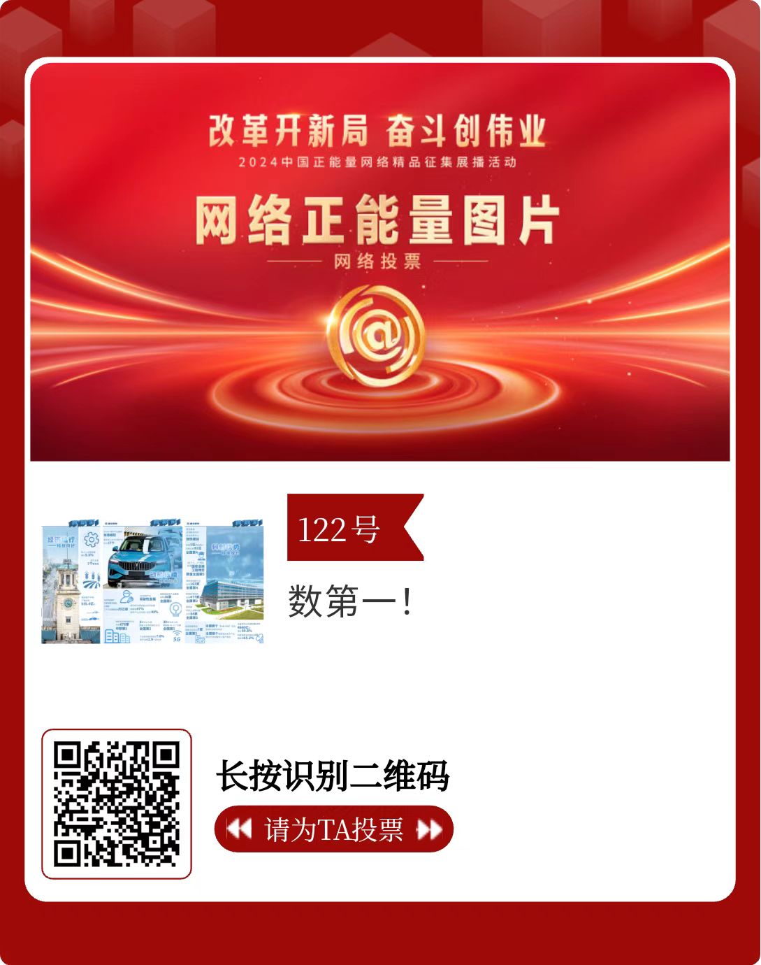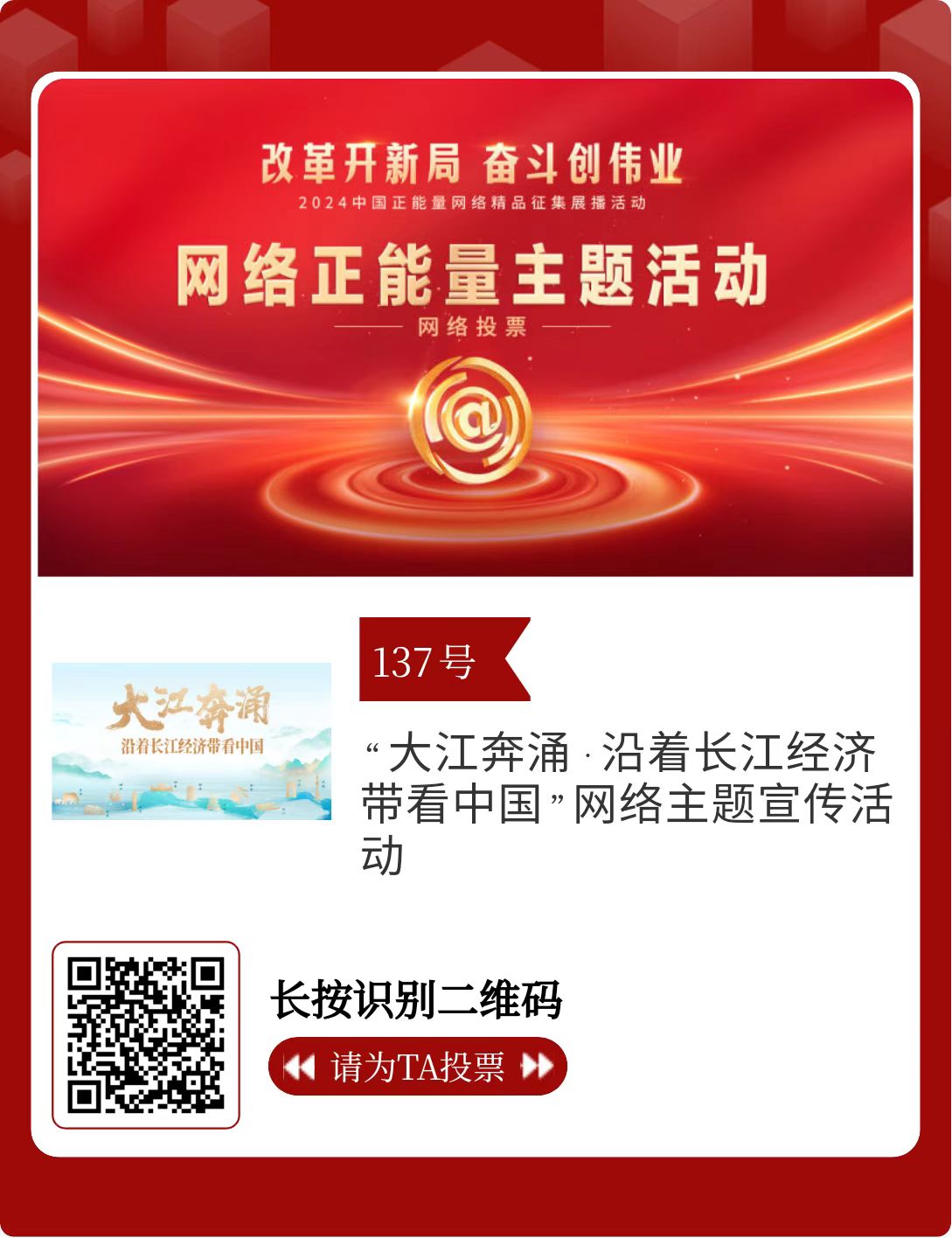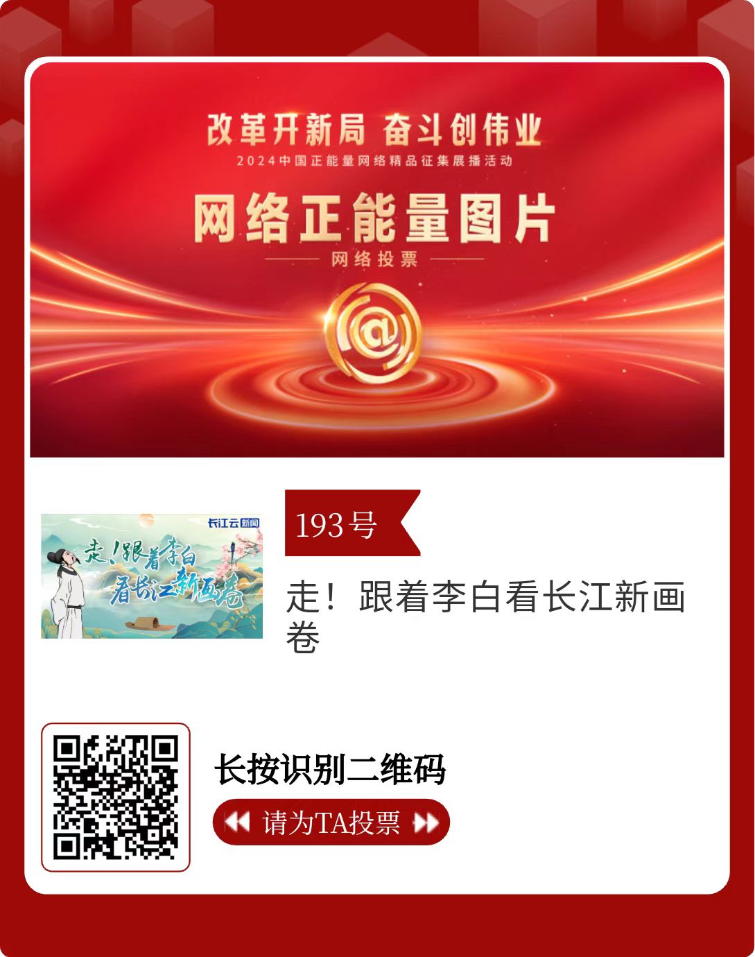 改革开新局,奋斗创伟业。由中央网信办主办的2024中国正能量网络精品征集展播活动启动网络展播投票,时间为2月15日至2月21日,投票结果将作为中国正能量网络精品遴选的重要参考。