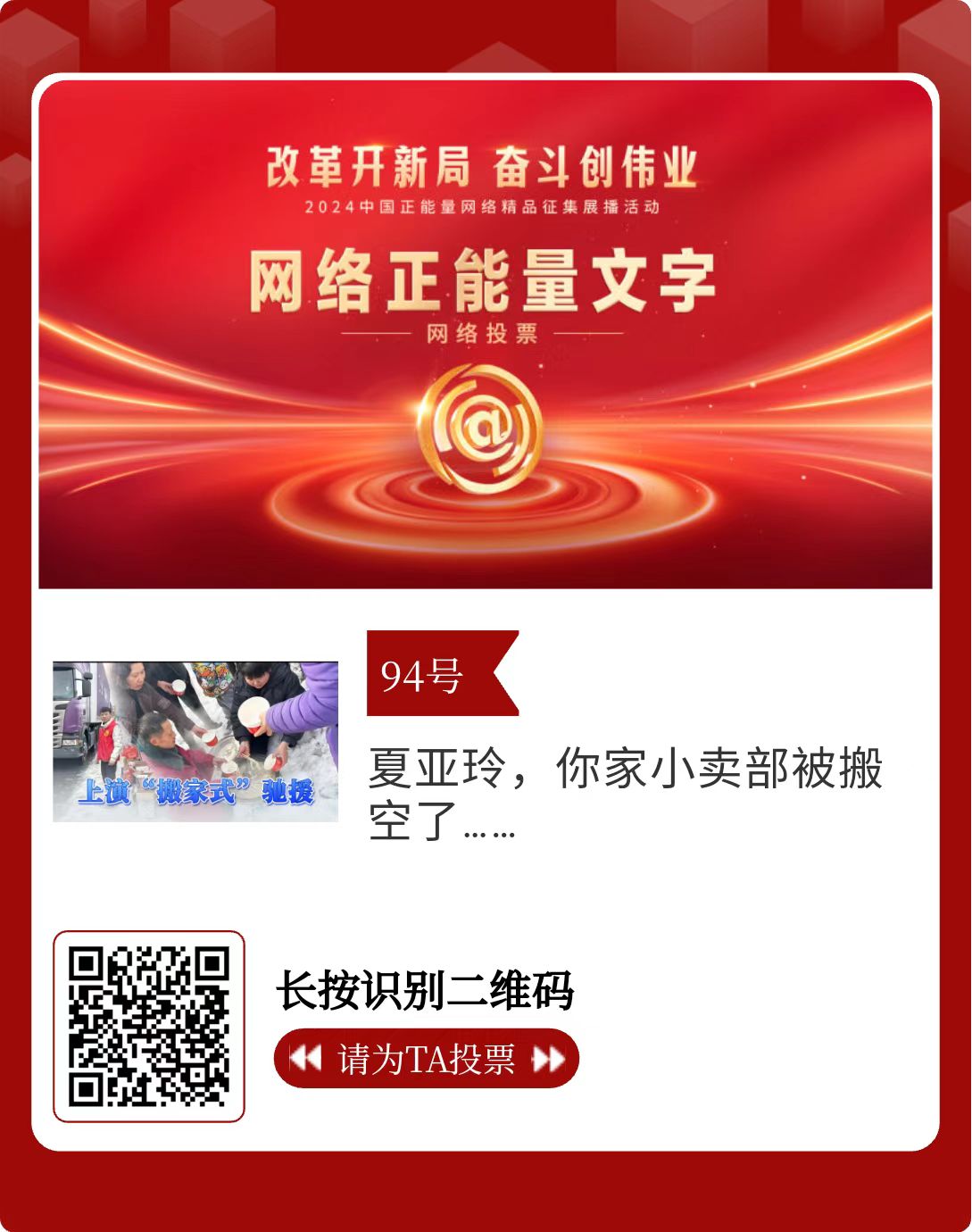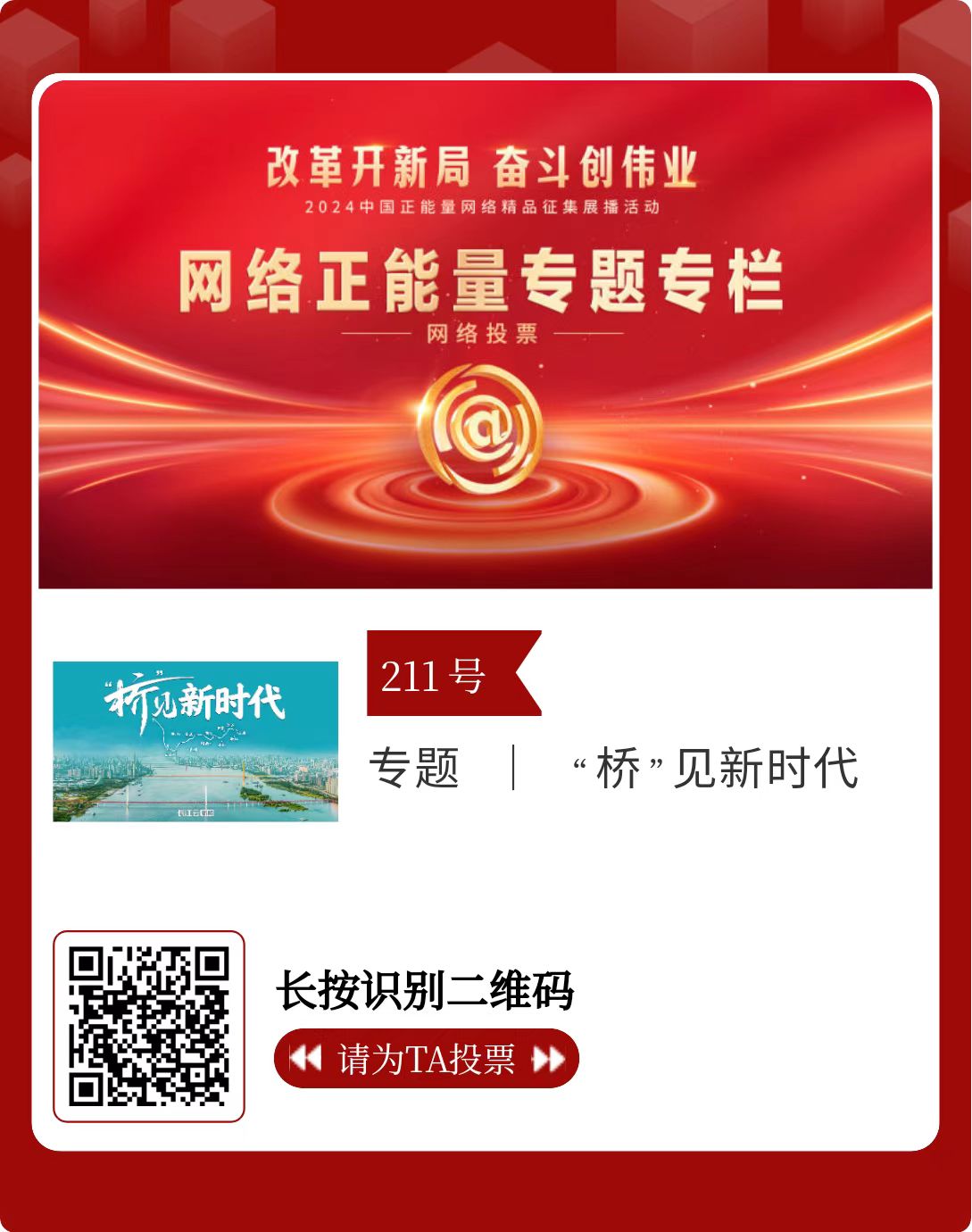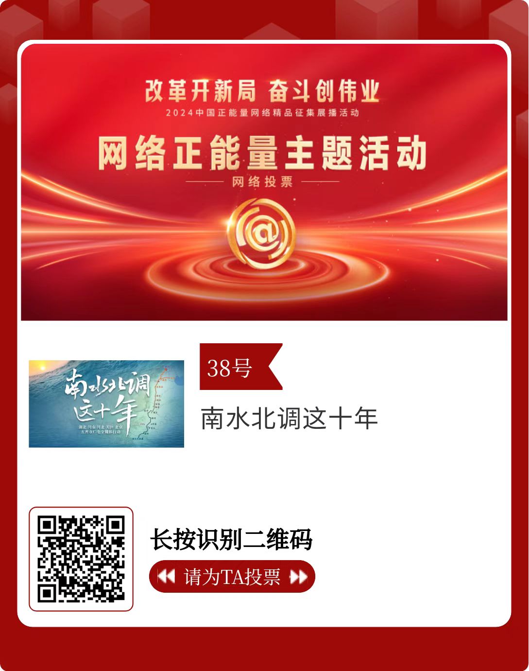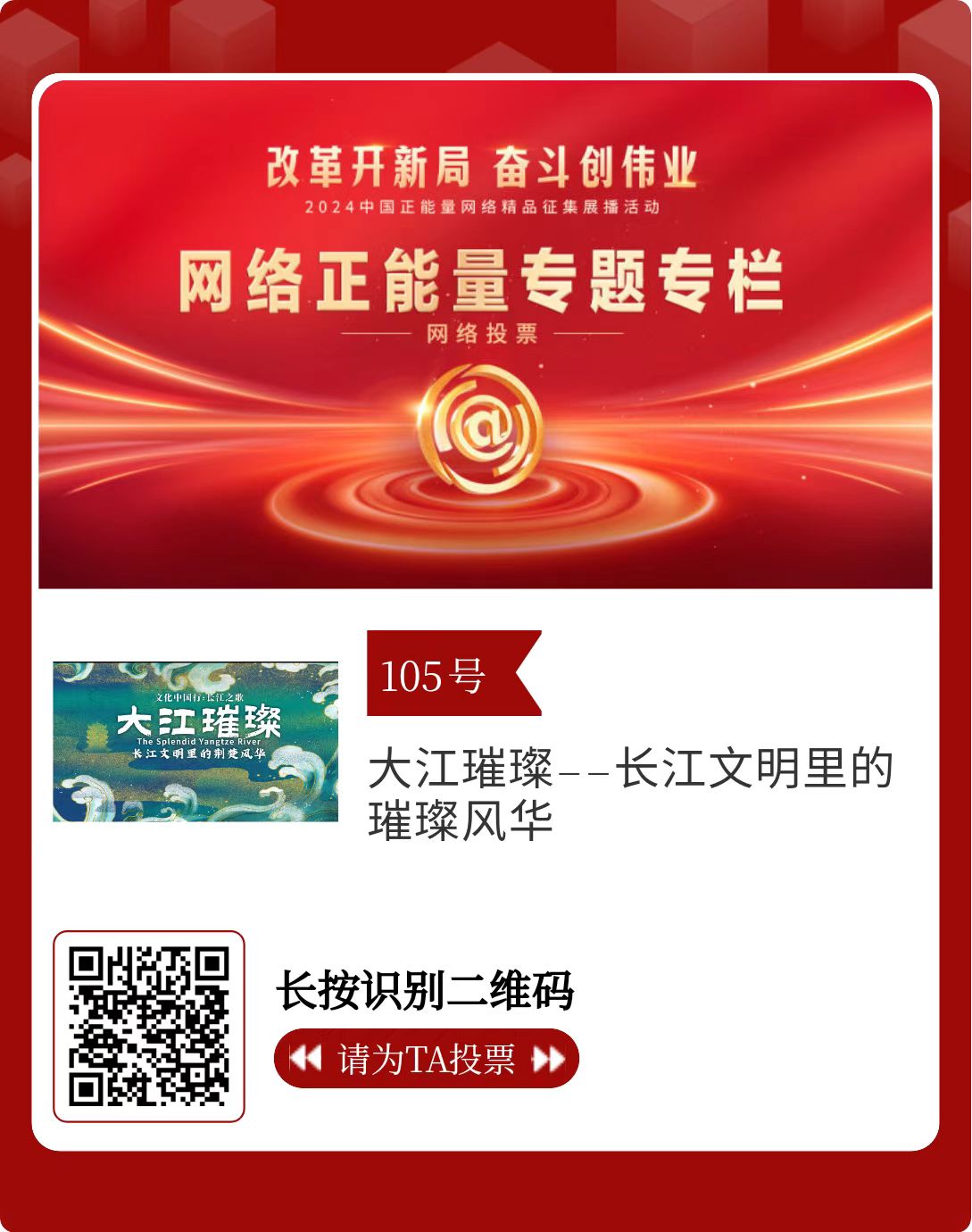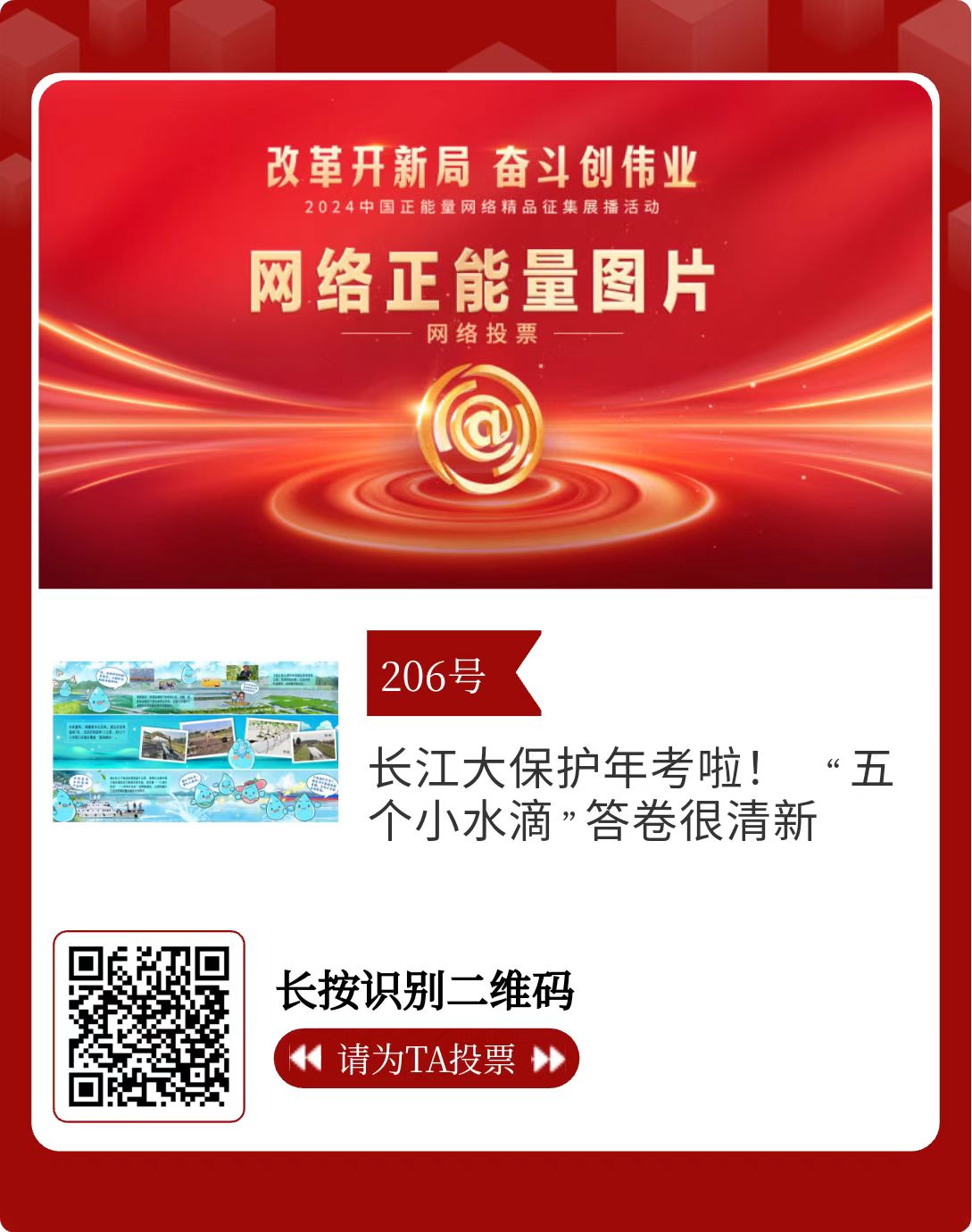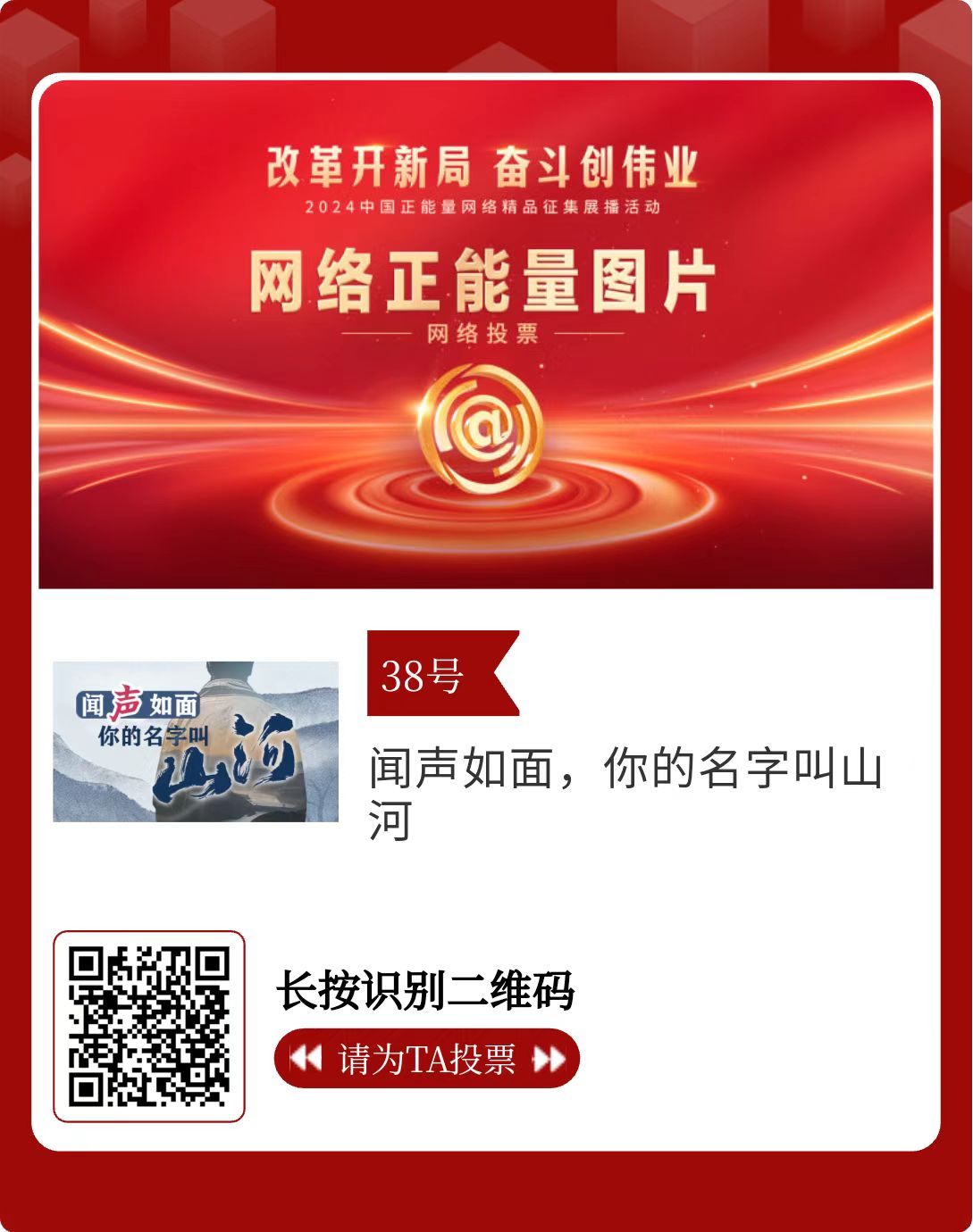 改革开新局,奋斗创伟业。由中央网信办主办的2024中国正能量网络精品征集展播活动启动网络展播投票,时间为2月15日至2月21日,投票结果将作为中国正能量网络精品遴选的重要参考。