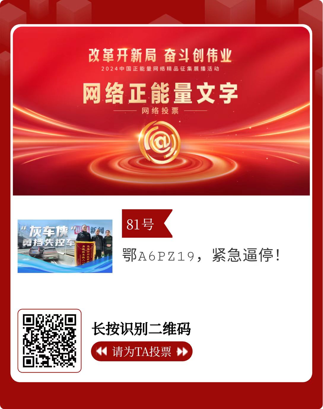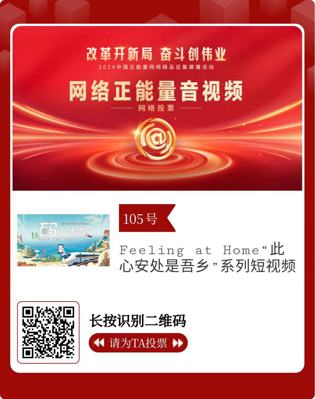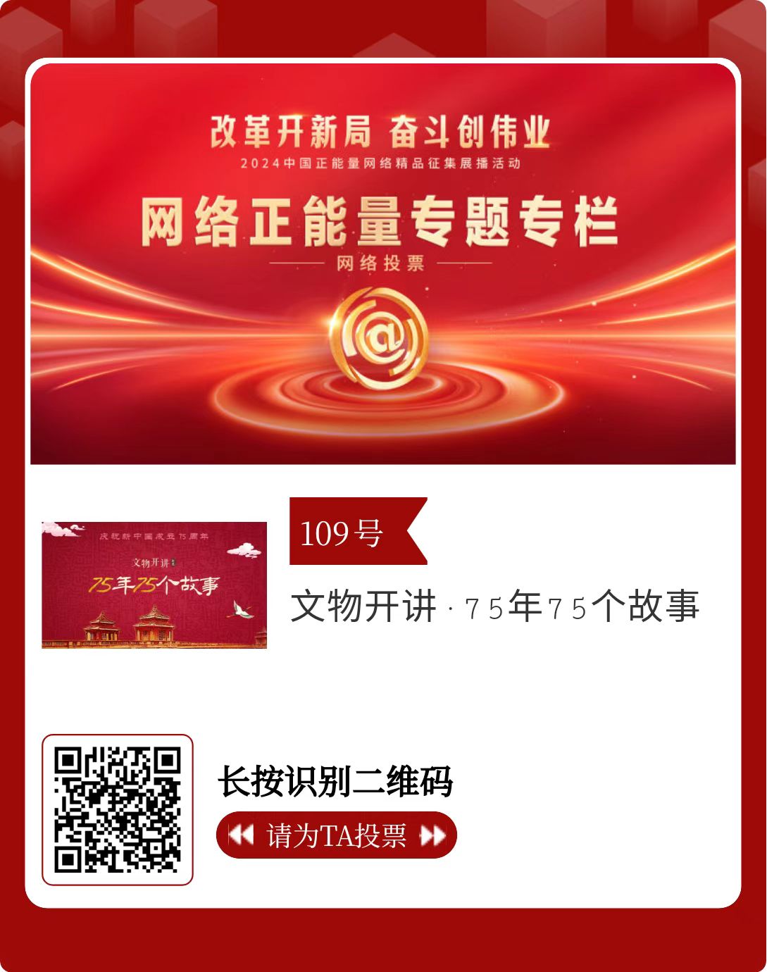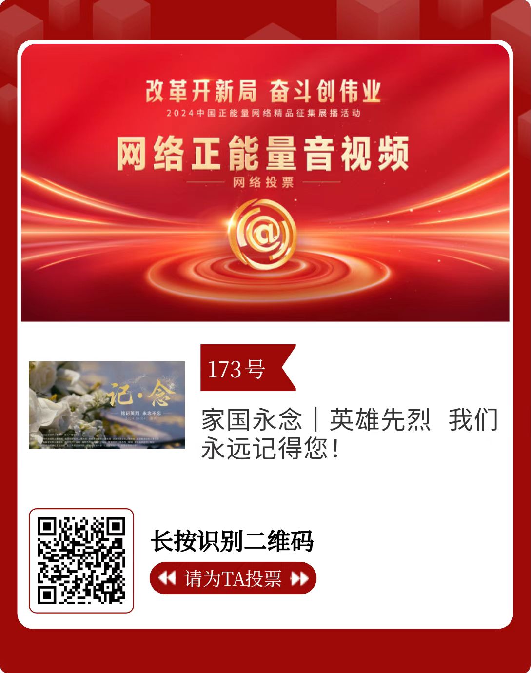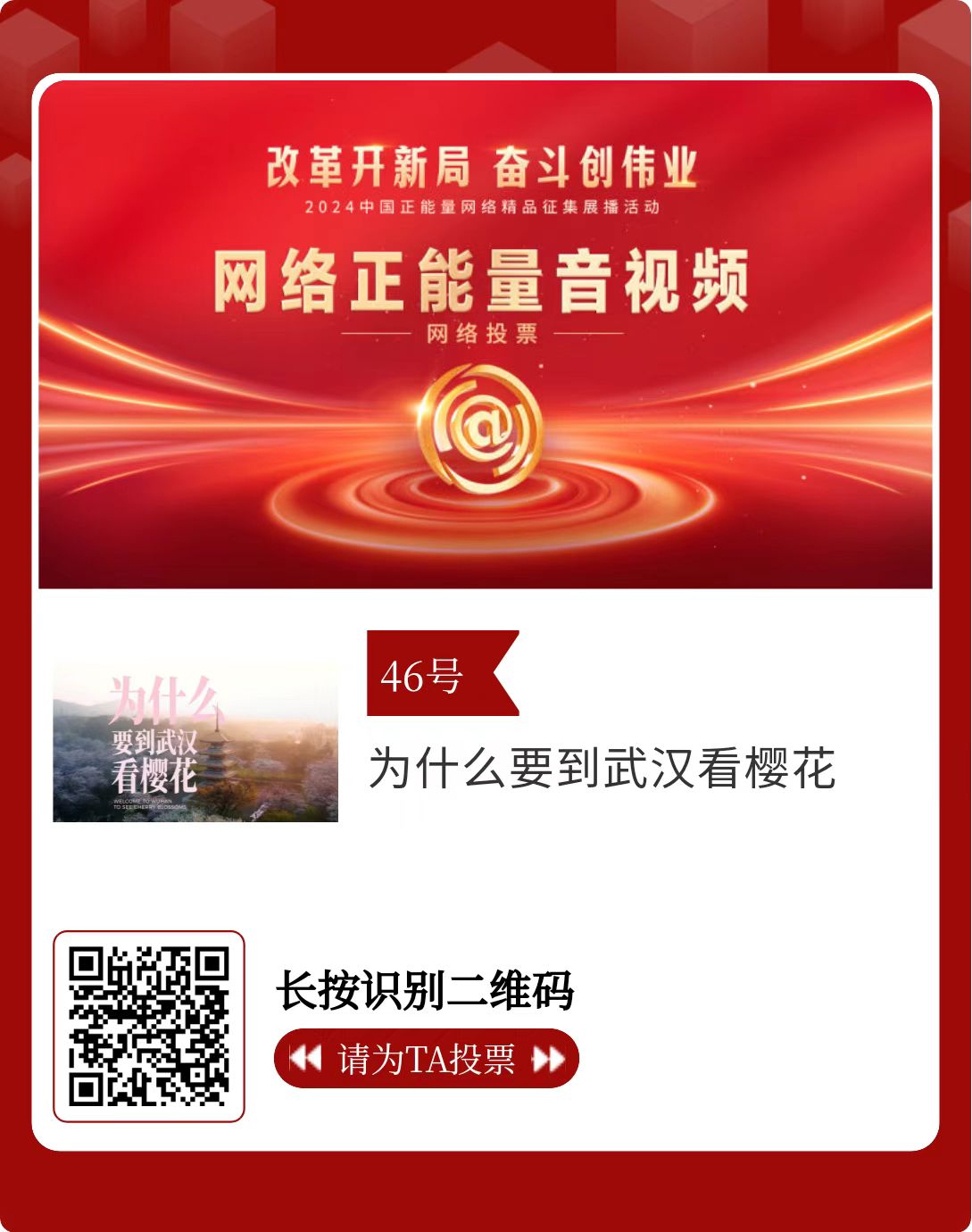 改革开新局,奋斗创伟业。由中央网信办主办的2024中国正能量网络精品征集展播活动启动网络展播投票,时间为2月15日至2月21日,投票结果将作为中国正能量网络精品遴选的重要参考。