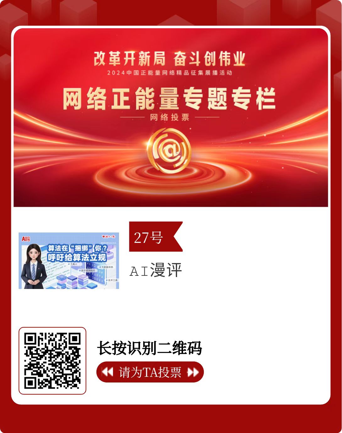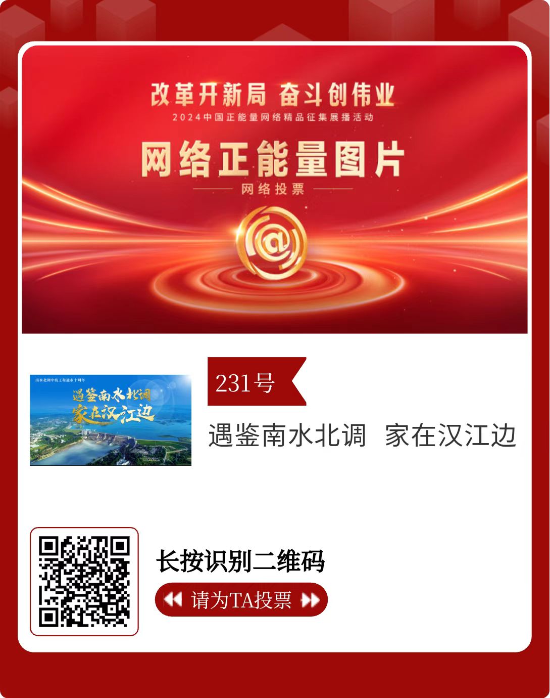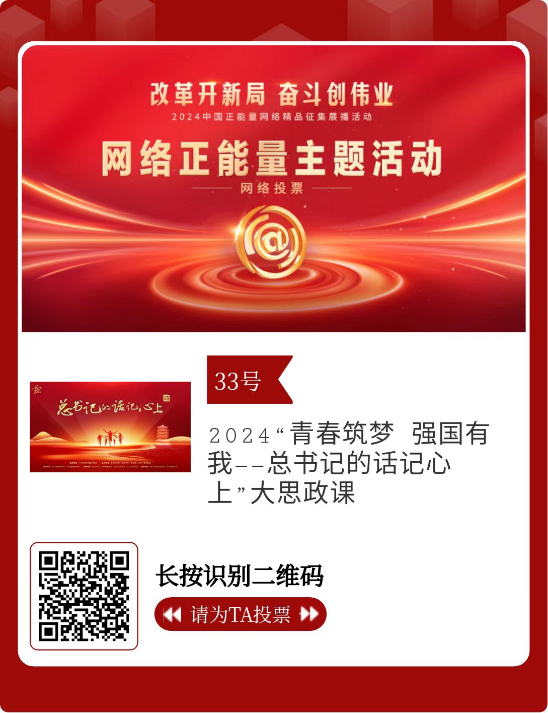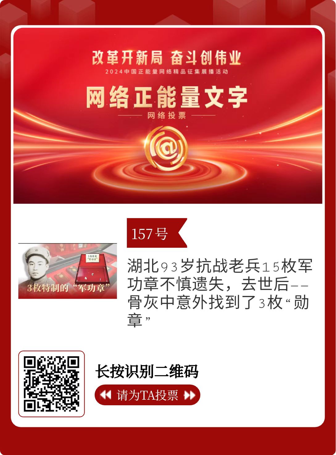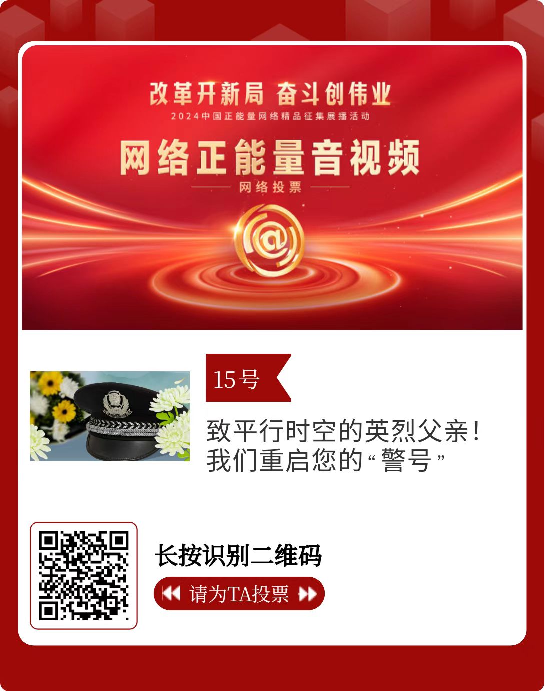 改革开新局,奋斗创伟业。由中央网信办主办的2024中国正能量网络精品征集展播活动启动网络展播投票,时间为2月15日至2月21日,投票结果将作为中国正能量网络精品遴选的重要参考。
