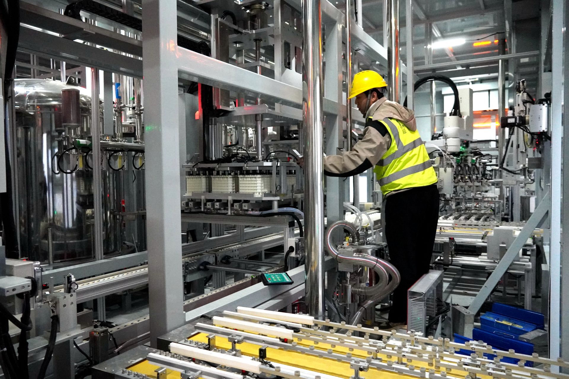踏入楚能新能源(宜昌)锂电池产业园项目一期二号电芯工厂,宽敞明亮的车间内,呈矩阵式整齐排列的1000多台(套)精密指示灯不停闪烁着,引导着物流运输的顺畅进行。AGV物流小车匀速运转,配合产线设备共同奏响着激昂澎湃的工业交响曲和新春奋进的最强音。