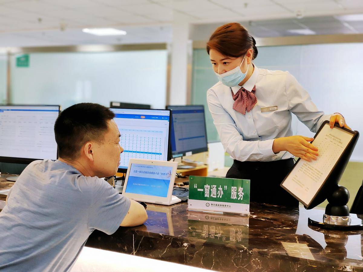 秭归县政务服务中心“一窗通办”窗口工作人员为群众介绍事项服务指南。(视界网 谭三要 摄)