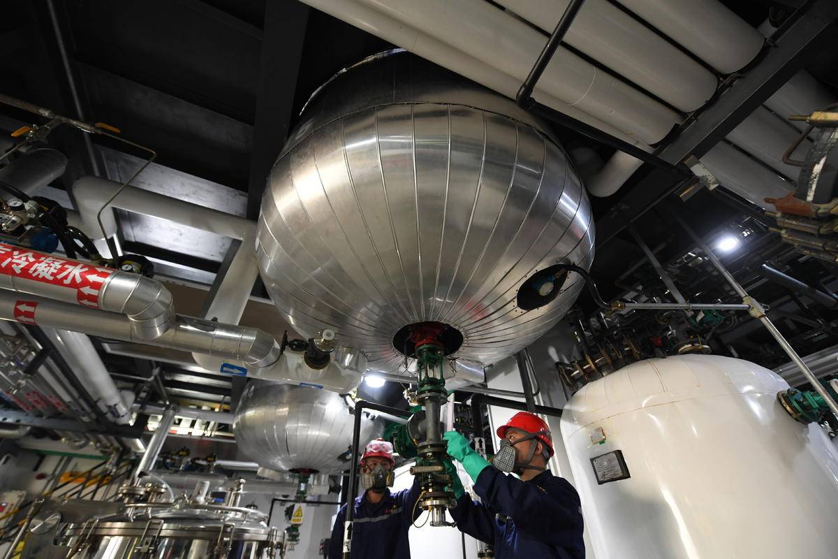 湖北天舒药业有限公司(宜城)员工在检查设备运行情况。(湖北日报全媒记者田悦 通讯员李锋、谢勇 摄)