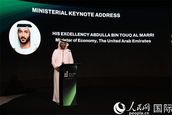 阿联酋经济部部长玛尔伊在“食品500强”工商论坛上致辞。人民网记者 张志文摄