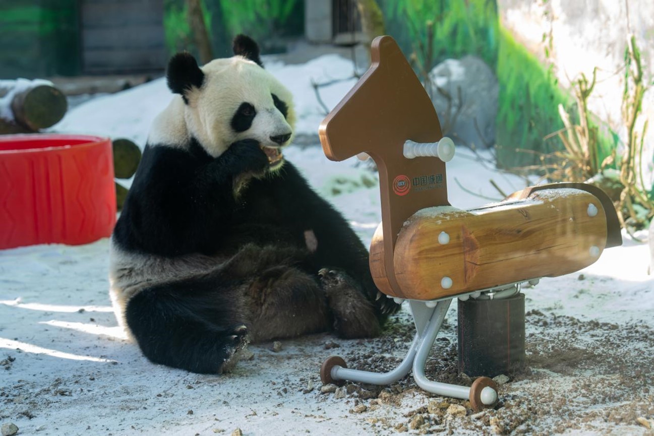 大熊猫“喀秋莎”在木马旁玩耍。中诚通国际投资有限公司供图