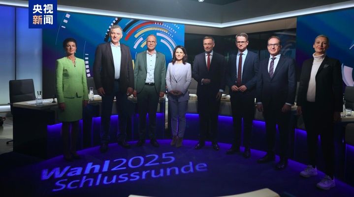 当地时间2月20日晚,在德国联邦议院选举前三天,来自八个政党的代表进行最后一场电视辩论,就乌克兰危机、欧洲安全、义务兵役和气候政策等关键议题展开了激烈交锋。 联盟党(由基民盟及其姐妹党基社盟组成)、社民党和绿党的总理候选人默茨、朔尔茨及哈贝克并未出席。