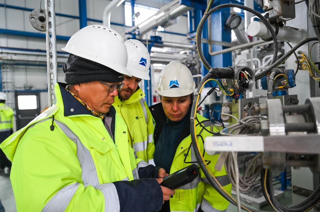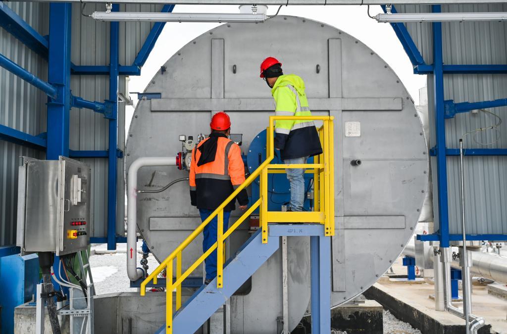 2月12日,中土两国工程师在土耳其阿克萨拉伊省的图兹湖地下天然气储库扩建项目地面场站查看设备。新华社记者刘磊摄