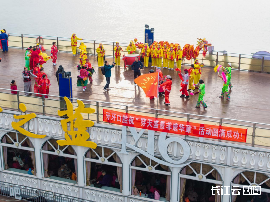 这次活动堪称一场民俗雅集。热闹非凡的舞龙舞狮表演,彰显着传统民俗的蓬勃活力。剪纸服饰秀《非遗遇上穿天节》惊艳众人,模特身着用剪纸元素制作的精美服饰,每一步都似一幅流动的剪纸画。最后,众人手拉手围在一起,欢快地唱起了《喊彩歌》,歌声中饱含着对生活的热爱和对传统文化的传承。游客陈女士站在甲板上感叹道:“在这江面上听着传说,看着表演,感觉真的穿越到了古代,触摸到襄阳文化的根。”
