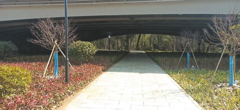 在该项目现场负责人的带领下,记者一行沿着新修建的游步道步行,下穿涢水一桥,就来到了白云公园,两个公园之间绿意盎然,地形自然过渡,毫无违和之感。