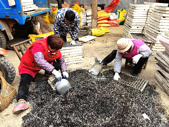 ▲榔坪镇梓榔坪村村民在筛取基质有机肥。(通讯员赵孟月 摄)