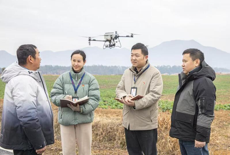 在大王镇下街村油菜种植基地,农技人员吴凤文穿梭在油菜田间,仔细查看生长态势,排查病虫害隐患,为种植户答疑解惑。他指导种植户精准识别病虫害初期症状,传授实用的应对方法,如依据土壤肥力与油菜生长状况精准追肥;及时开展清沟排水作业,有效维持田间湿度的适度平衡,促进油菜茁壮生长。同时,还调配了植保无人机开展农药喷施作业,将科技融入农业生产,提升病虫害防治效率。