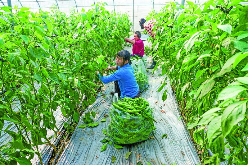 24日上午,在大冶市大箕铺镇银瑞蔬菜大棚里,农户在采摘、搬运、分拣,将新鲜的螺丝辣椒采收供应市场,丰富群众“菜篮子”。 通讯员 瞿泽敏 摄