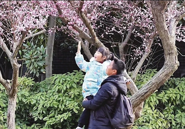 随州日报讯(全媒记者李文军)2月27日,记者在随城白云公园看到,园内梅花绽放,红、粉、绿三色花瓣在暖阳下竞相摇曳,暗香浮动。