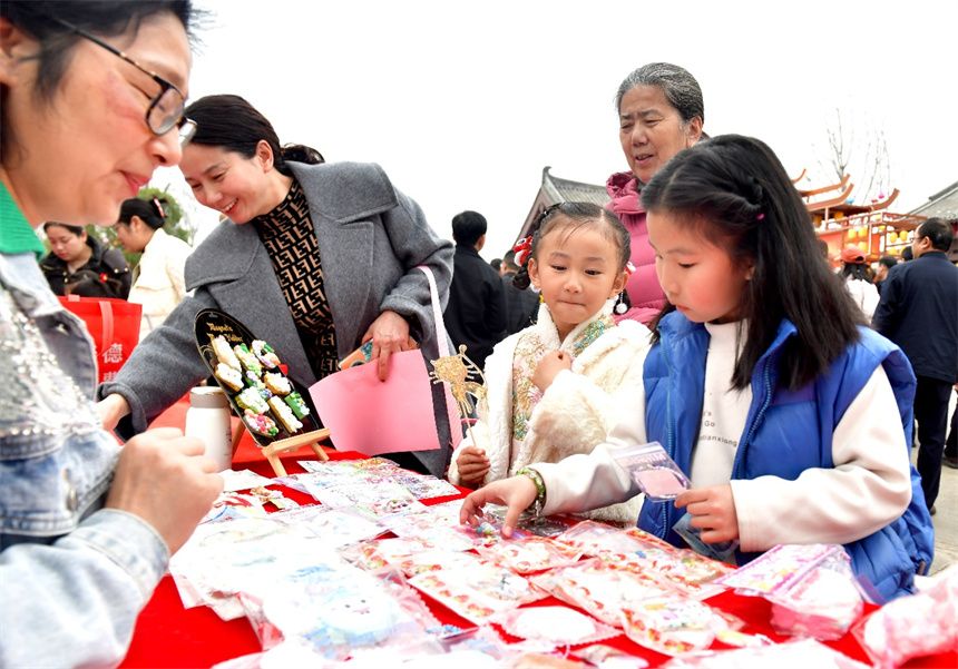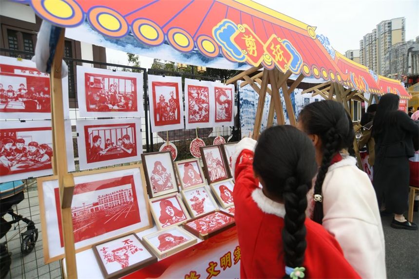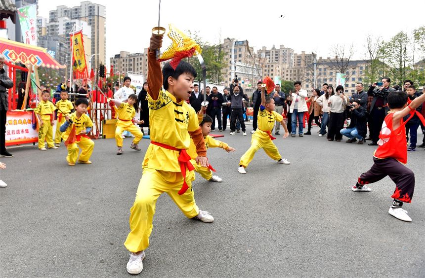 在非遗集市,浓浓的传统文化气息扑面而来。缠花、剪纸、竹雕等非遗展示摊位备受欢迎。咸宁非遗鱼门拳的小传承人们扮成“哪吒”的形象“大展拳脚”,引得人们驻足拍摄。