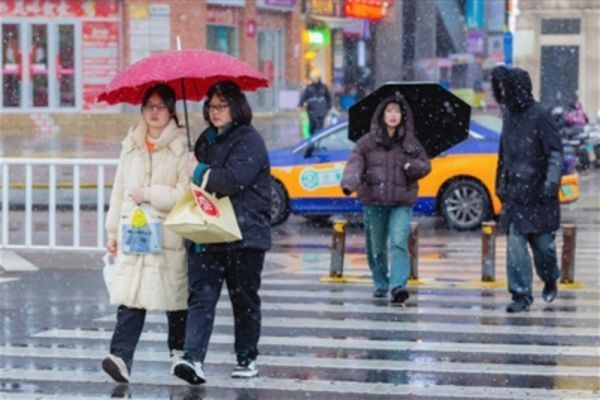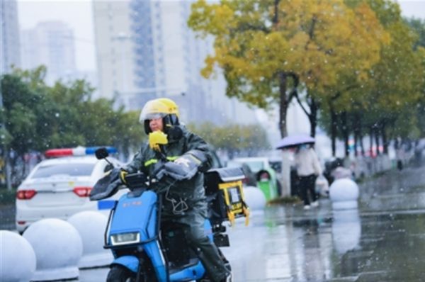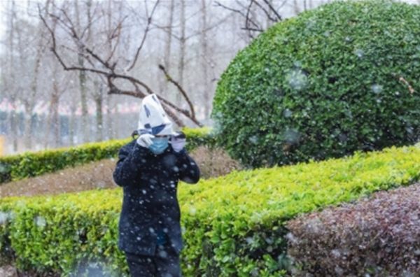 受寒潮影响,昨日,我市出现大风、雨雪天气,城区降雪明显,部分地区已出现积雪,为城市增添了别样景致。