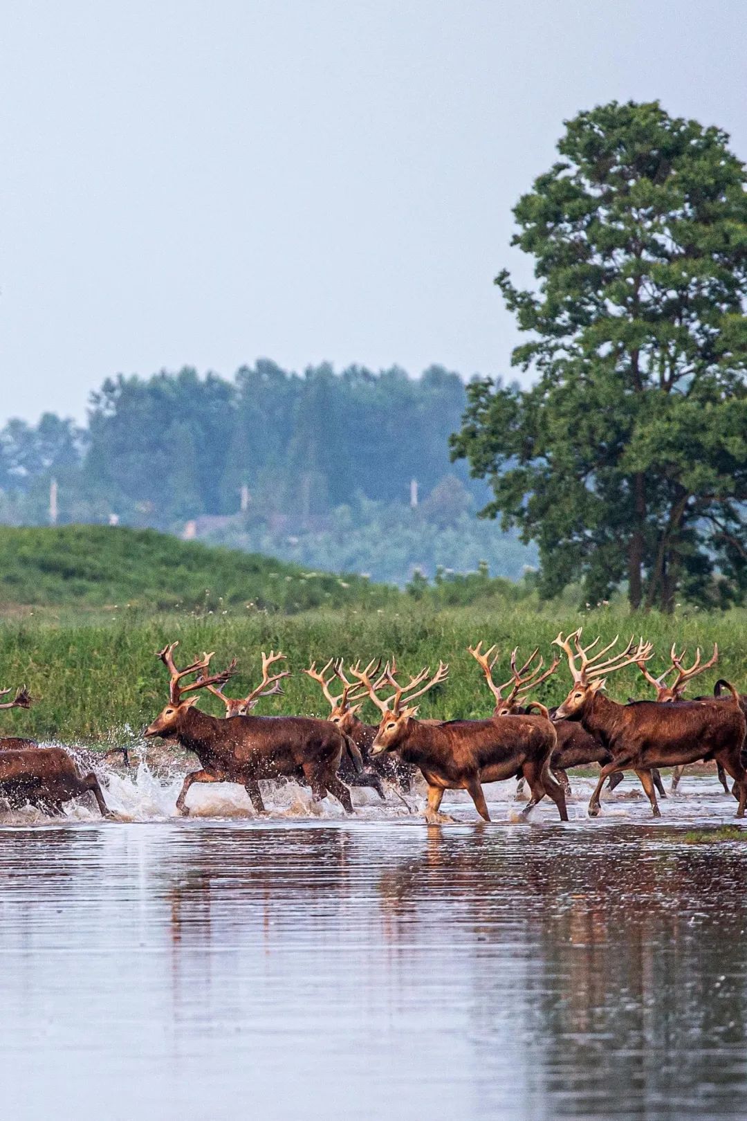 麋鹿大家庭在长江故道石首天鹅洲滩涂上嬉戏追逐,一派和谐的生态画卷。(湖北日报全媒记者 梅涛 摄)