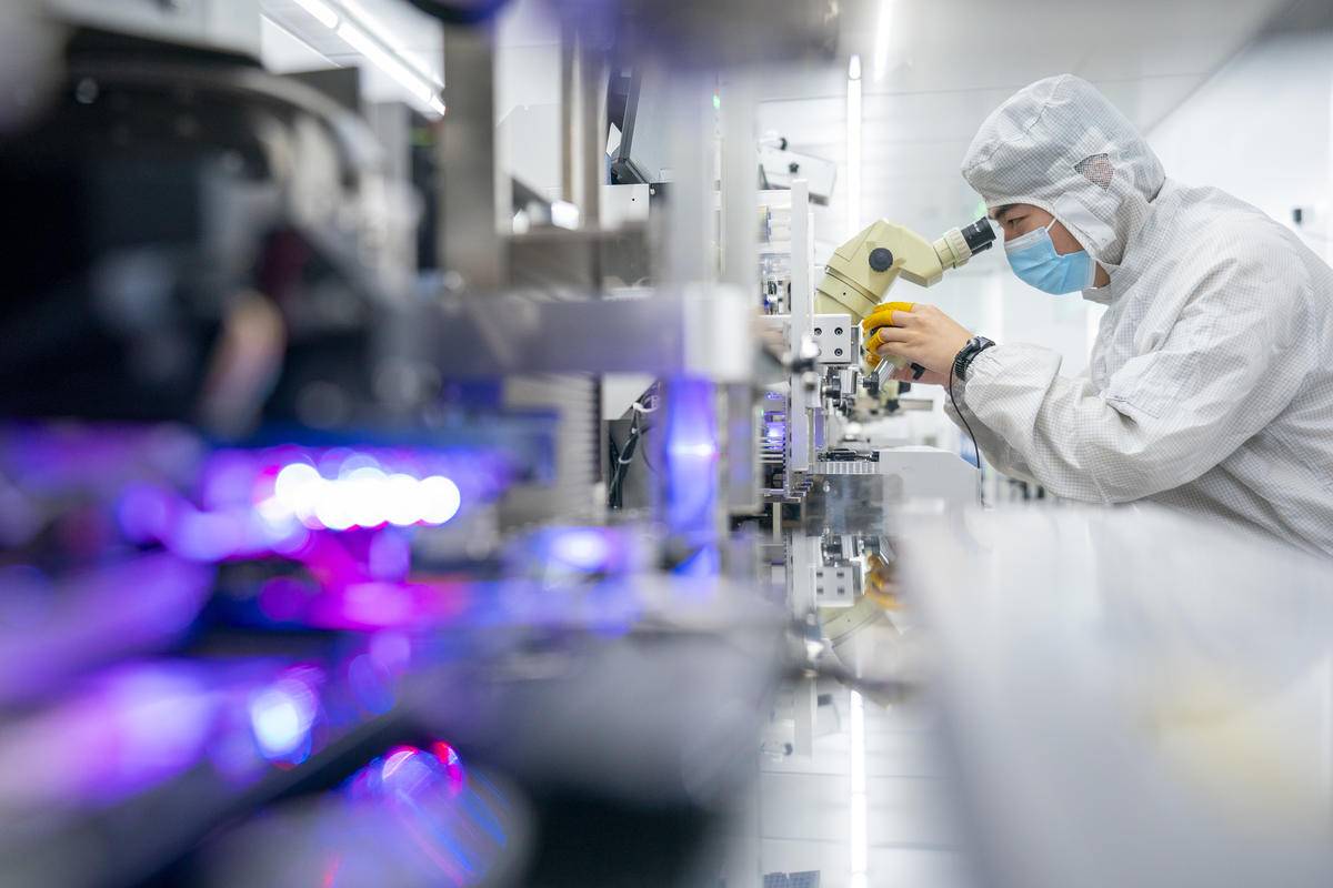 2024年12月18日,光迅科技高端光电子器件产业基地洁净厂房,员工在生产、测试AI数据中心用高速光模块。(湖北日报全媒记者 魏铼 摄)