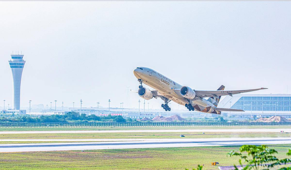 2023年8月18日,一架阿提哈德航空的波音777-200全货机在鄂州花湖机场起飞。(湖北日报全媒记者 薛婷 通讯员 刘小进 何旭峰 摄)