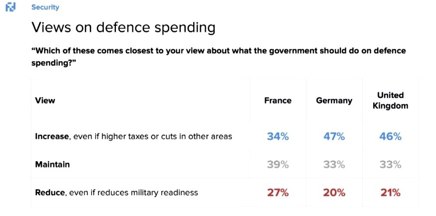 同时,大幅增加国防开支目前也未能获得欧洲民意大多数支持。欧洲一家运用人工智能进行研究的机构日前在布鲁塞尔发布的一项民意调查显示,只有34%的法国受访者支持增加国防开支,德国和英国的支持比例也仅为47%和46%。