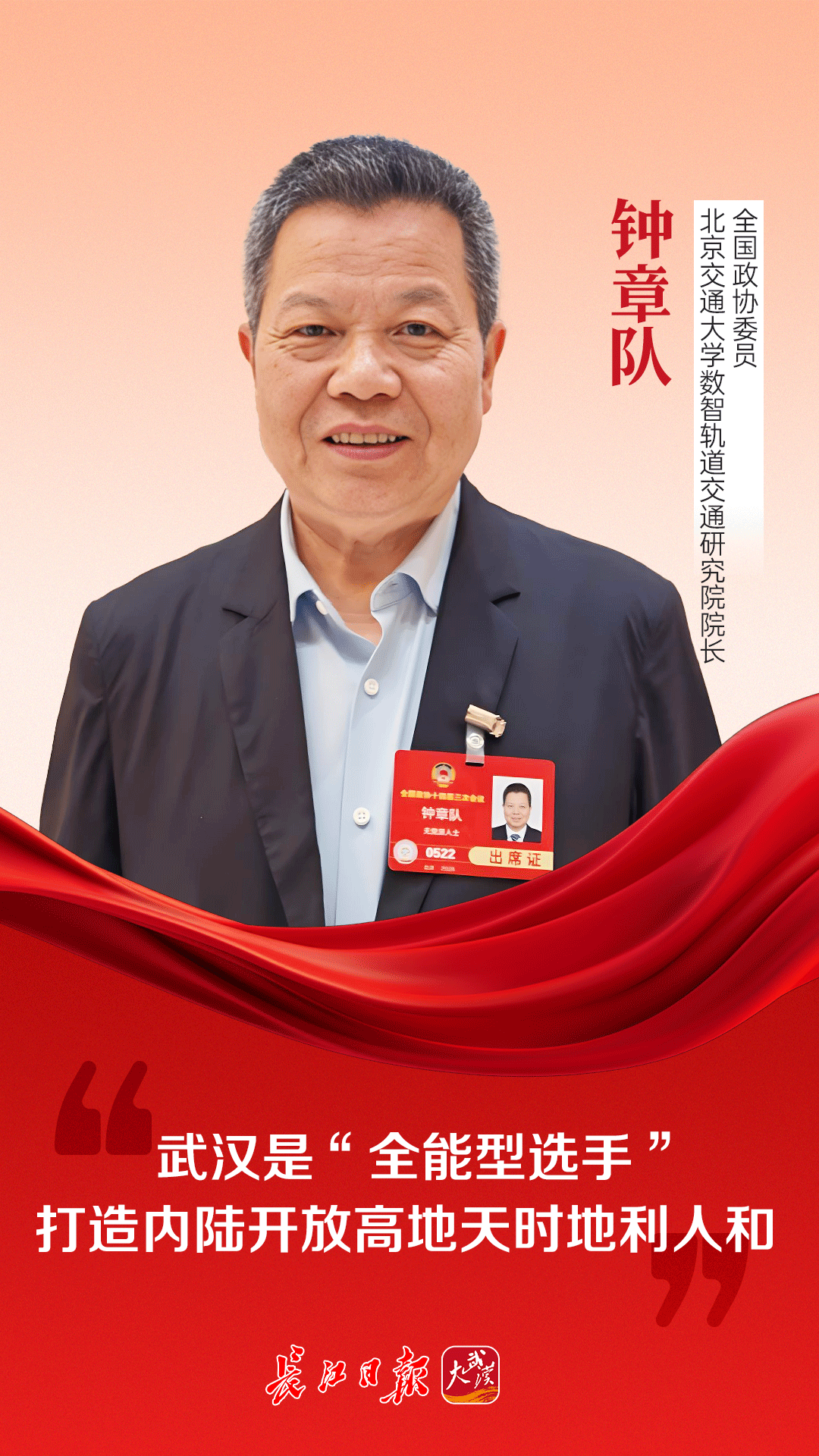 3月6日,全国政协委员、北京交通大学数智轨道交通研究院院长钟章队说:“武汉这个地方太好了。水路是自然形成的,万吨级船舶都能直达武汉,阳逻港也是长江中上游最大的集装箱港口。不仅如此,武汉的民航交通也很发达,高铁也很发达,公路更不用说。国家又将亚洲第一个专业货运枢纽机场放在了毗邻武汉的鄂州。”