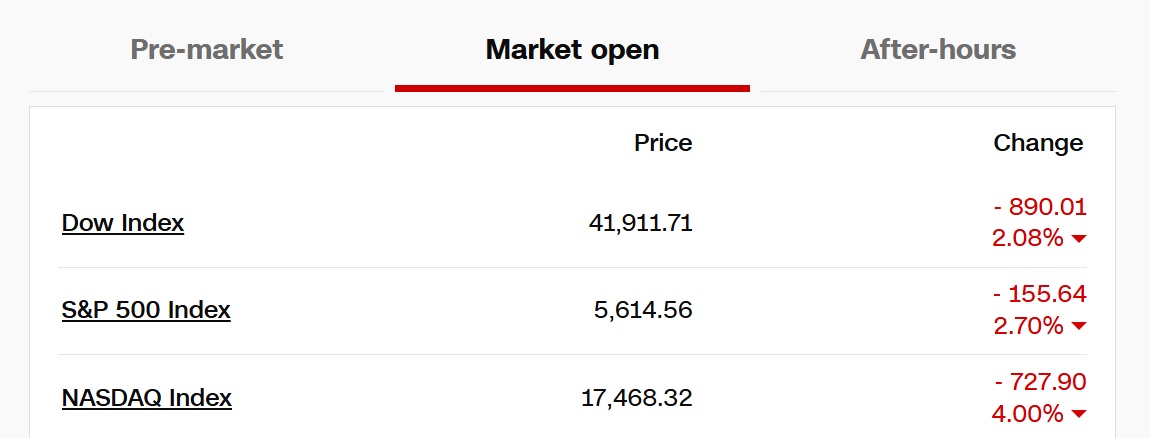截至10日收盘时,美股三大指数集体收跌,道指跌2.08%,纳指跌4%,标普500指数跌2.7%。