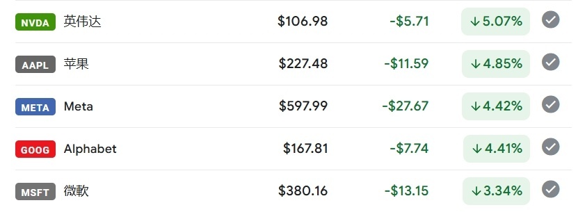 △10日收盘时,英伟达、苹果、Meta、谷歌和微软股价均大幅下跌。